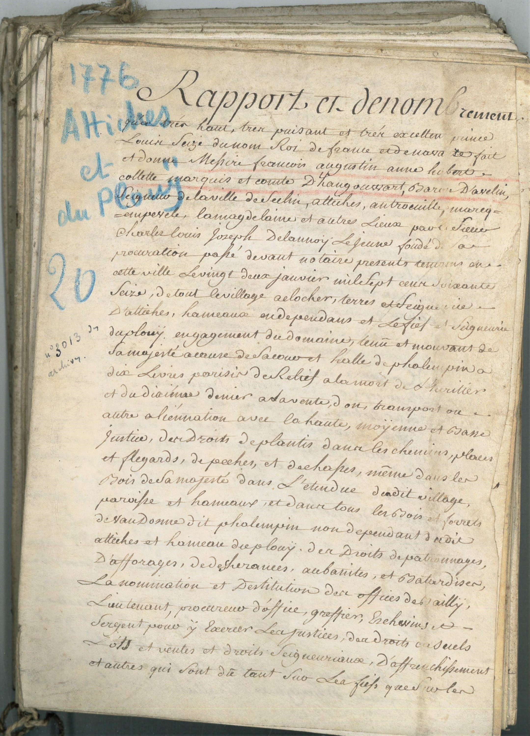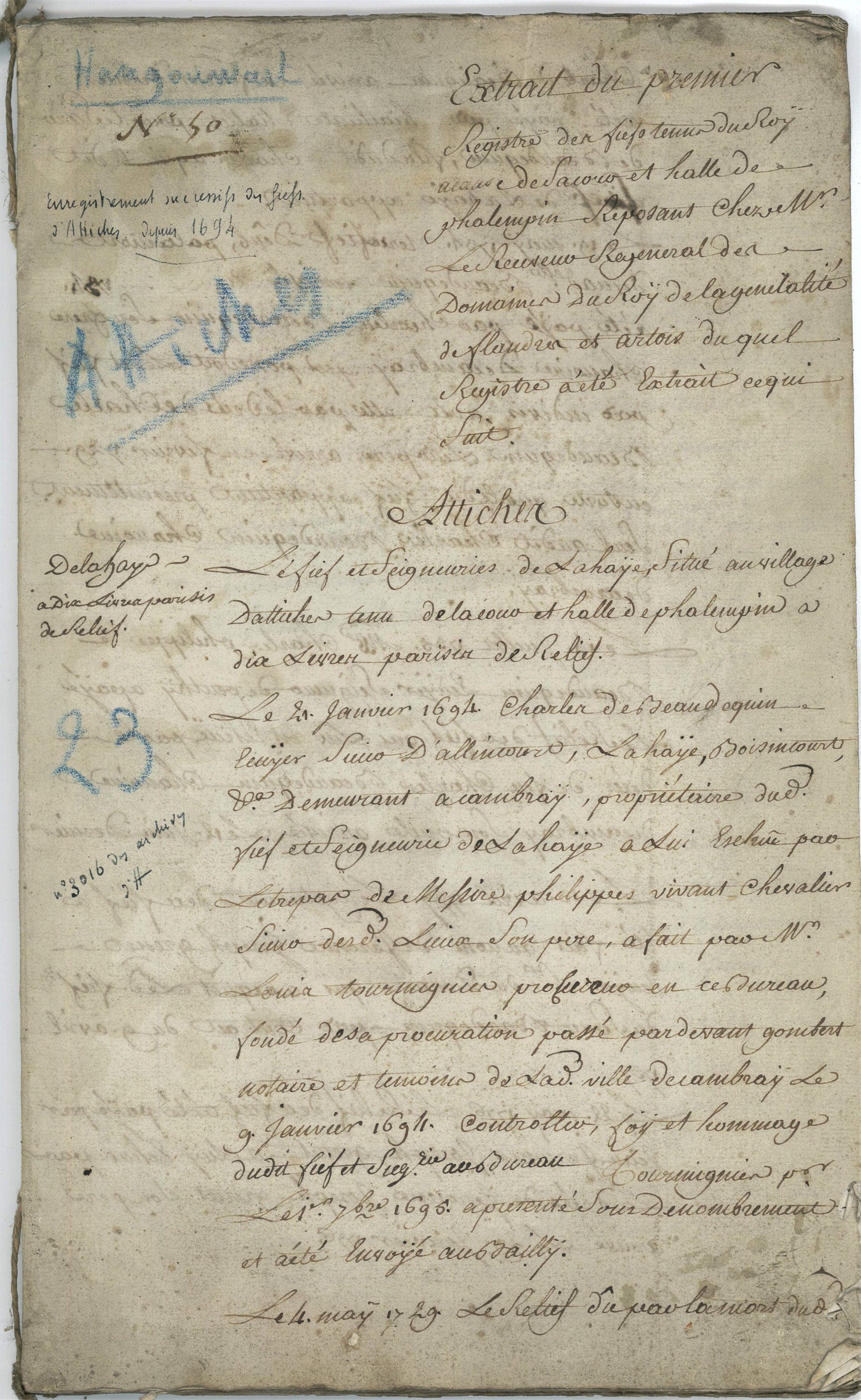 Collation, 26 novembre 1718, de lacte dachat du fief, terre et seigneurie dAttiches par Charles Philippe de Hangouart, comte dAvelin, seigneur de Seclin ; Mémoire relevant les fiefs dépendants de la seigneurie dAttiches, 18e siècle, 67 pp. in-fol. ; Rapport et dénombrement de tout le village, terres et seigneurie dAttiches et du Plouy appartenant au marquis dHangouart, 1776, 164 pp. in4 ; Habouts de la carte dAttiches, 18e siècle, 28 pp. in-fol. ; etc.