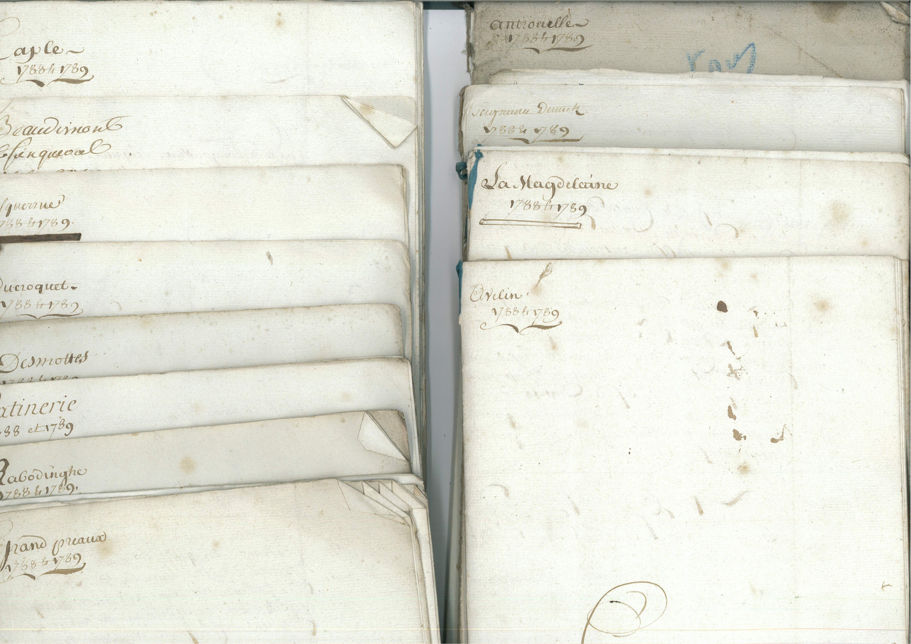 Réunion de 21 cahiers manuscrits in-folio, établis en 1789 ; comptes des rentes seigneuriales faits entre le notaire et arpenteur royal de Lille et le marquis et conte dHangouart, pour les années 1788 et 1789, concernant les seigneuries dAvelin, La Magdelaine, Seclin, Dumetz, Antrouelles, Grand Préaux, Bourignier, Duquesnel, Patinerie, Petit Préaux, Ducroquet, Baudimont, Caples, Attiches, etc.