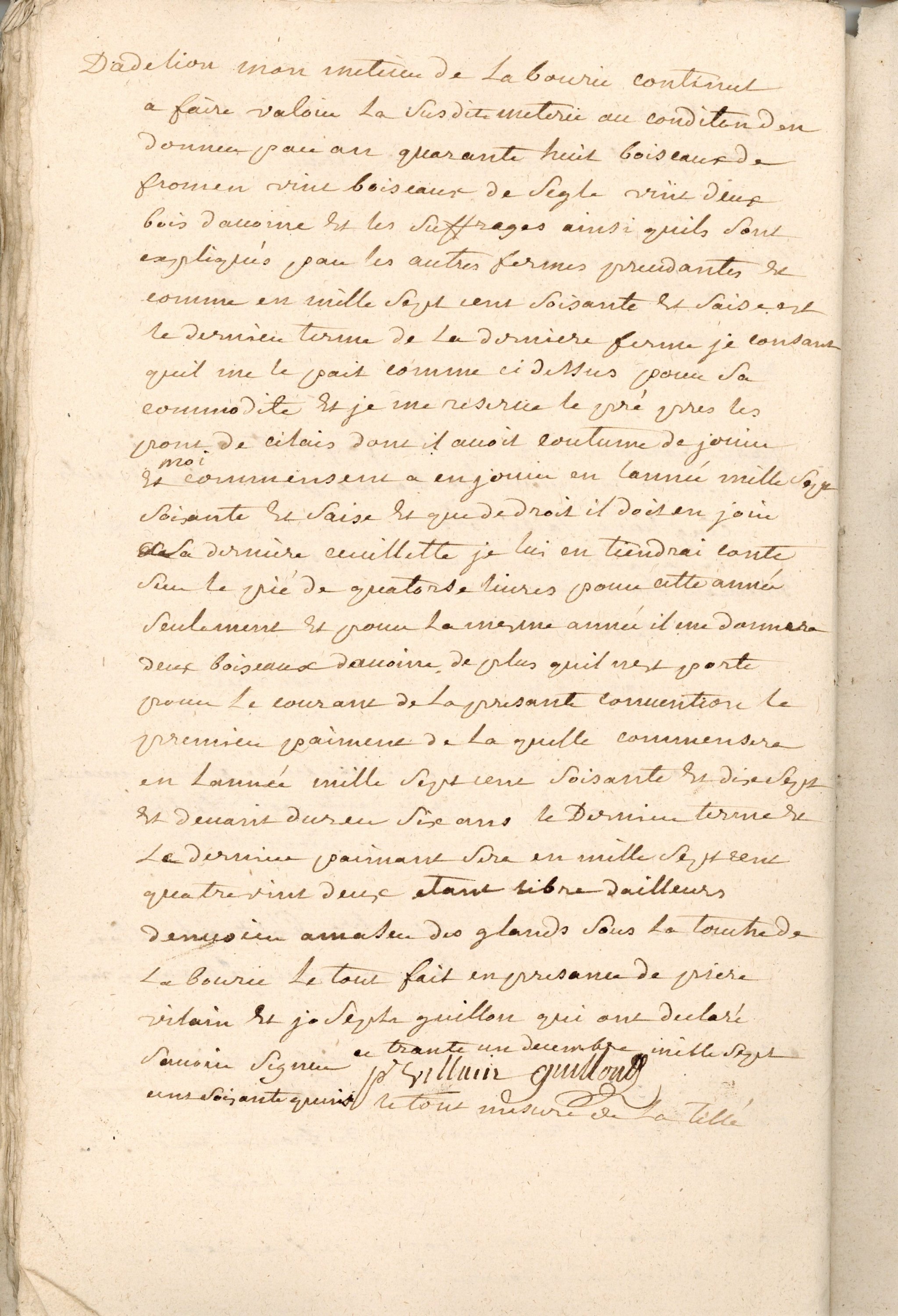 Cahier manuscrit anonyme, 1769-1775, 86 pages in-folio ; livre de comptes tenus par des régisseurs inscrivant les paiements des fermes et locatures, ventes de bleds, vins et bétails, des rentes dues, du coût de la main d’œuvre journalière, des travaux de maçonnerie, de ferronnerie, etc ; concerne des exploitations agricoles des communes de Vasles et alentours (Deux-Sèvres et Vienne) : Vaubrune, la Giborlière, la Gourjaudière, la Bourie, etc.