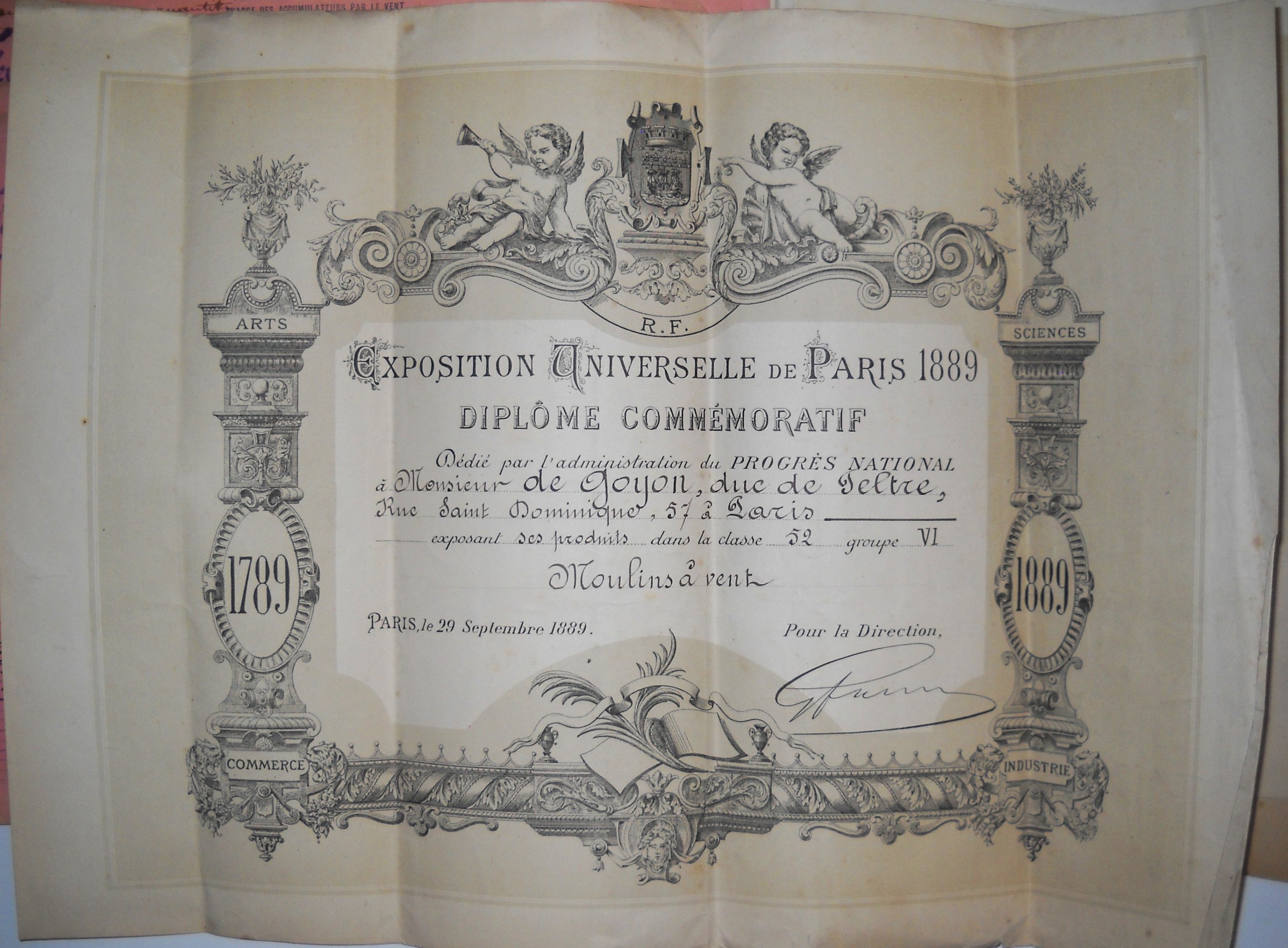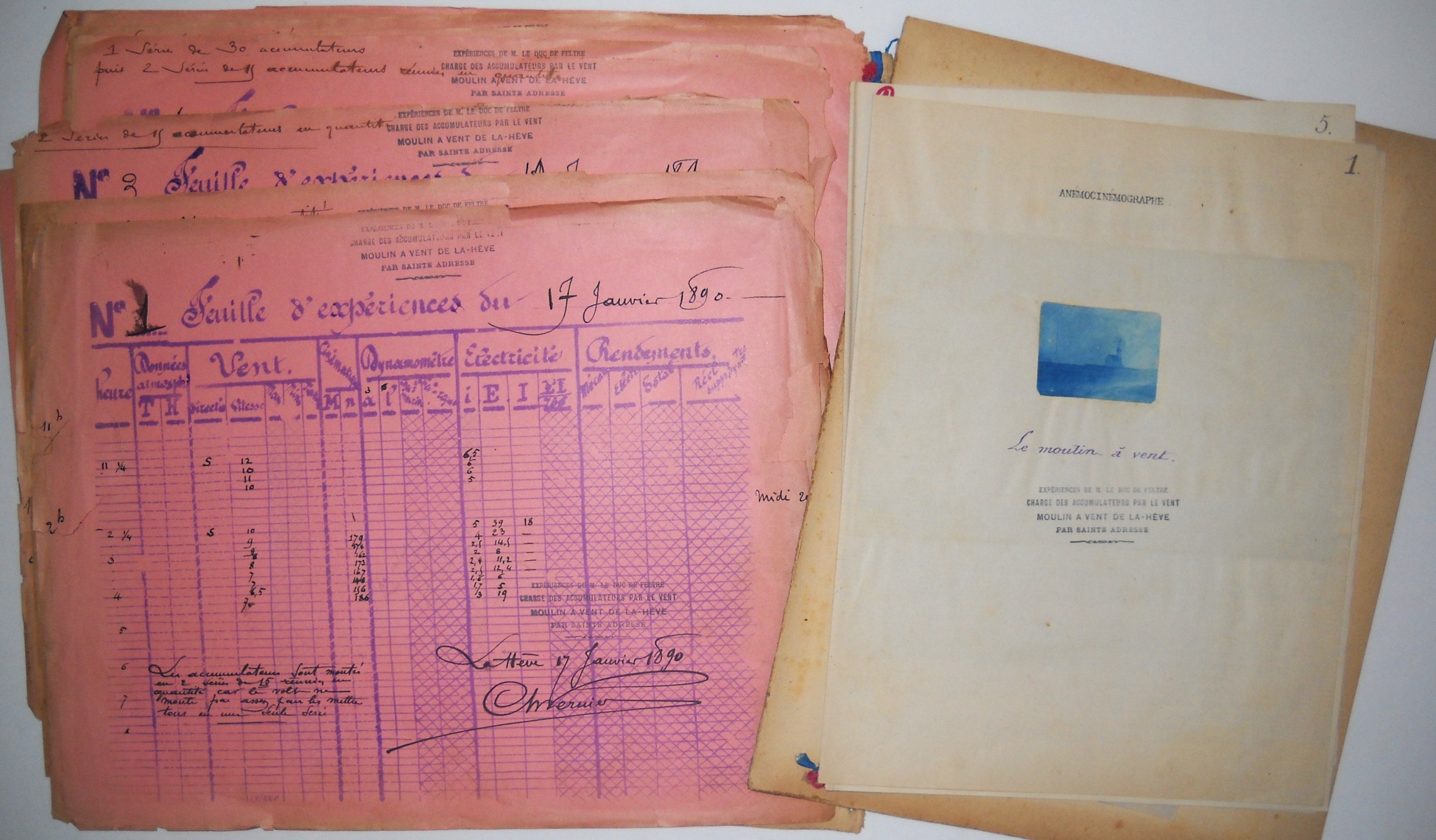 Dossier contenant les feuilles d’expérience et les relevés des charges des accumulateurs du moulin à vent de la Hève situé à Sainte-Adresse, appartenant à Charles Michel de Goyon (1844-1930), duc de Feltre + diplôme décerné lors de l’exposition universelle de Paris en 1889 ; le duc de Feltre eut l’idée d’utiliser la force du vent pour produire de l’électricité en installant des charges d’accumulateur au sein de son moulin de la Hève, dans le but de louer l’électricité produite aux agriculteurs avoisinants, à un coût moins cher que celle produite par machine à vapeur. Ne connaissant pas encore très bien le transport de l’électricité, il proposa à l’Etat de fournir l’électricité à l’un des phares de la Hève près du Havre.