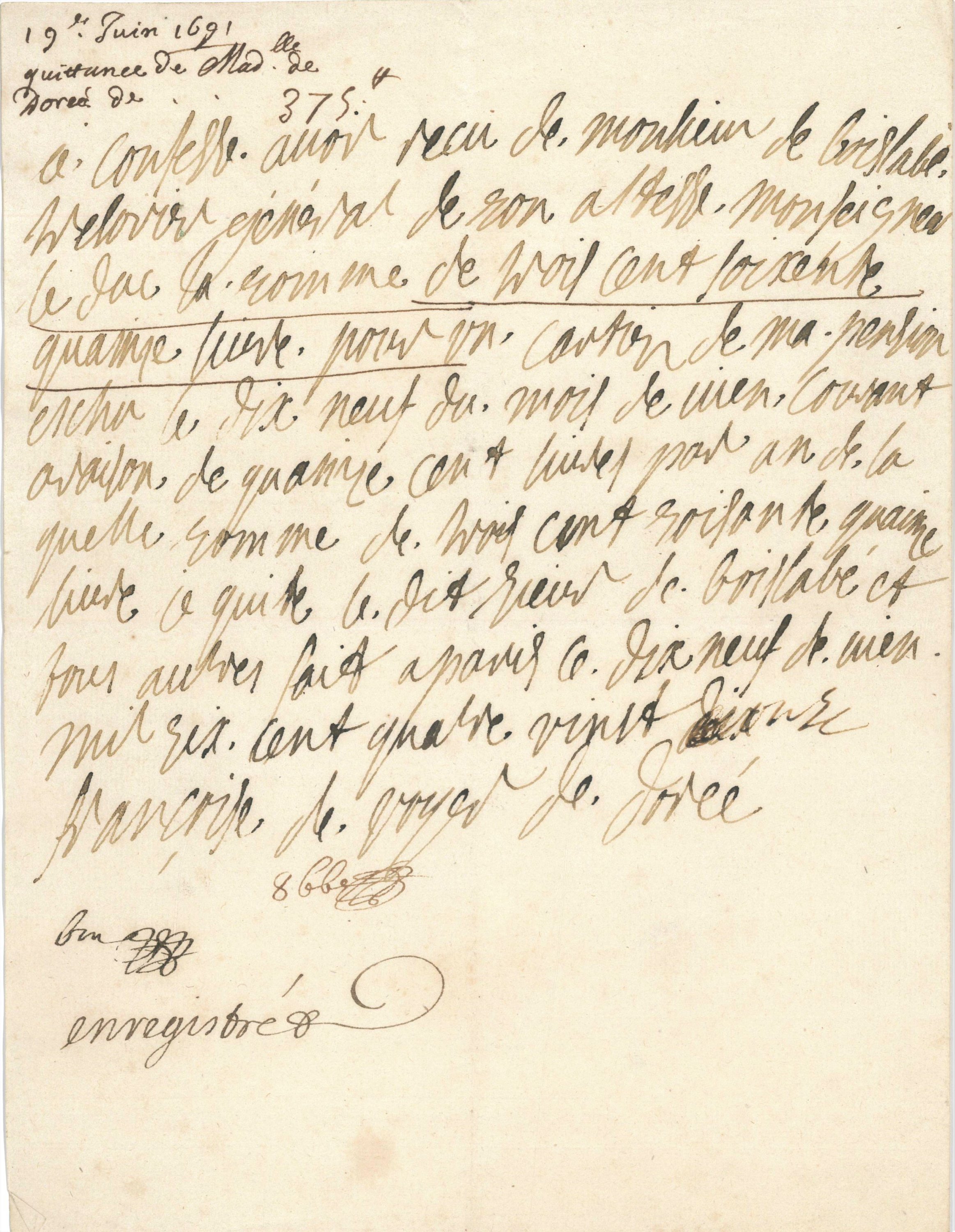 P.A.S., Paris, 19 juin 1691, Françoise de Voyer de Paulmy de Dorée, dite Mademoiselle de Dorée, dame de la cour, maîtresse éphémère en 1681 du roi Louis XIV, puis fille dhonneur de la duchesse de Bourbon, 1 page in-8 ;