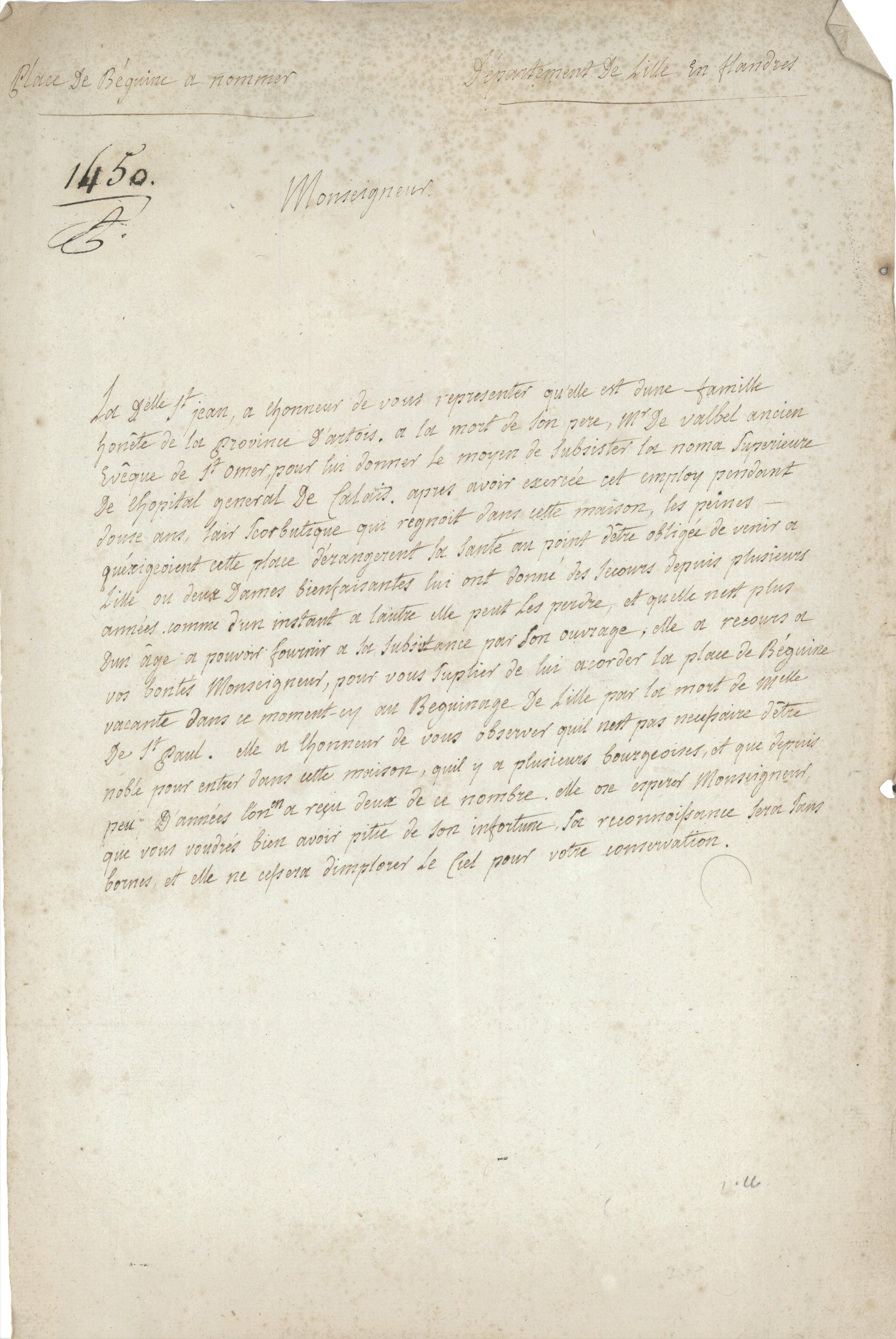 Demande de placement au béguinage de Lille par lancienne supérieure de lhôpital général de Calais, 1 page in-fol.