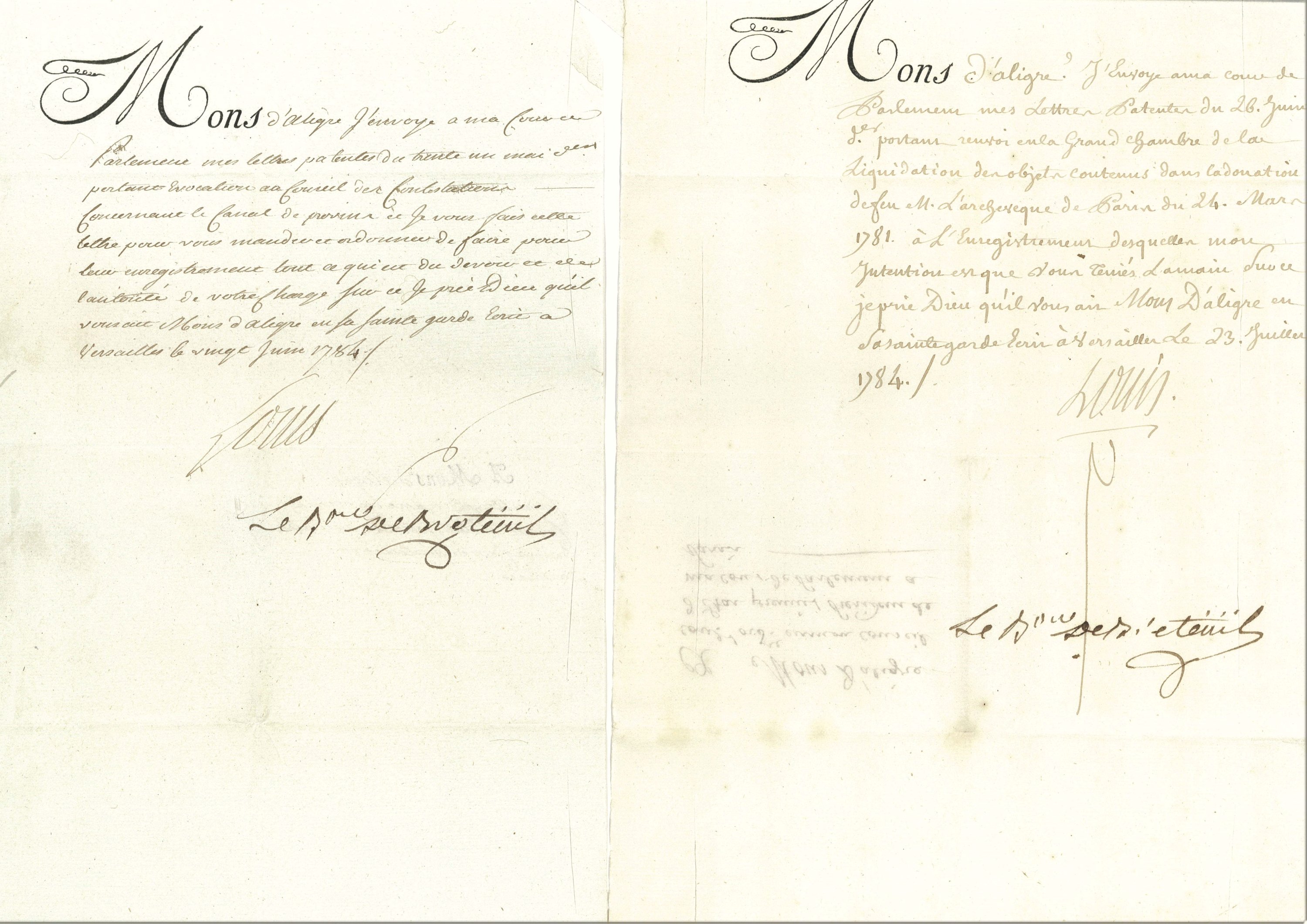 Réunion de 5 L.S., Versailles, 1783-1784, « Louis » (secrétaires du roi), contresignées par les secrétaires d’Etat à la Maison du roi Antoine-Jean Amelot de Chaillou et Louis Auguste Le Tonnelier baron de Breteuil, adressées à Etienne comte de Marans et marquis d’Aligre (1727-1798), président du parlement de Paris, 5 pages in-folio, relatives à la liquidation de la donation de l’archevêque de Paris, à la réunion de la justice de Fleury à celle de Villers-Cotterêts, à l’abolition du droit d’Aubaine entre la France et la principauté de la Leyen (Etat allemand), à l’acquisition d’un terrain pour la nouvelle halle aux cuirs à Paris, au canal de Provins.