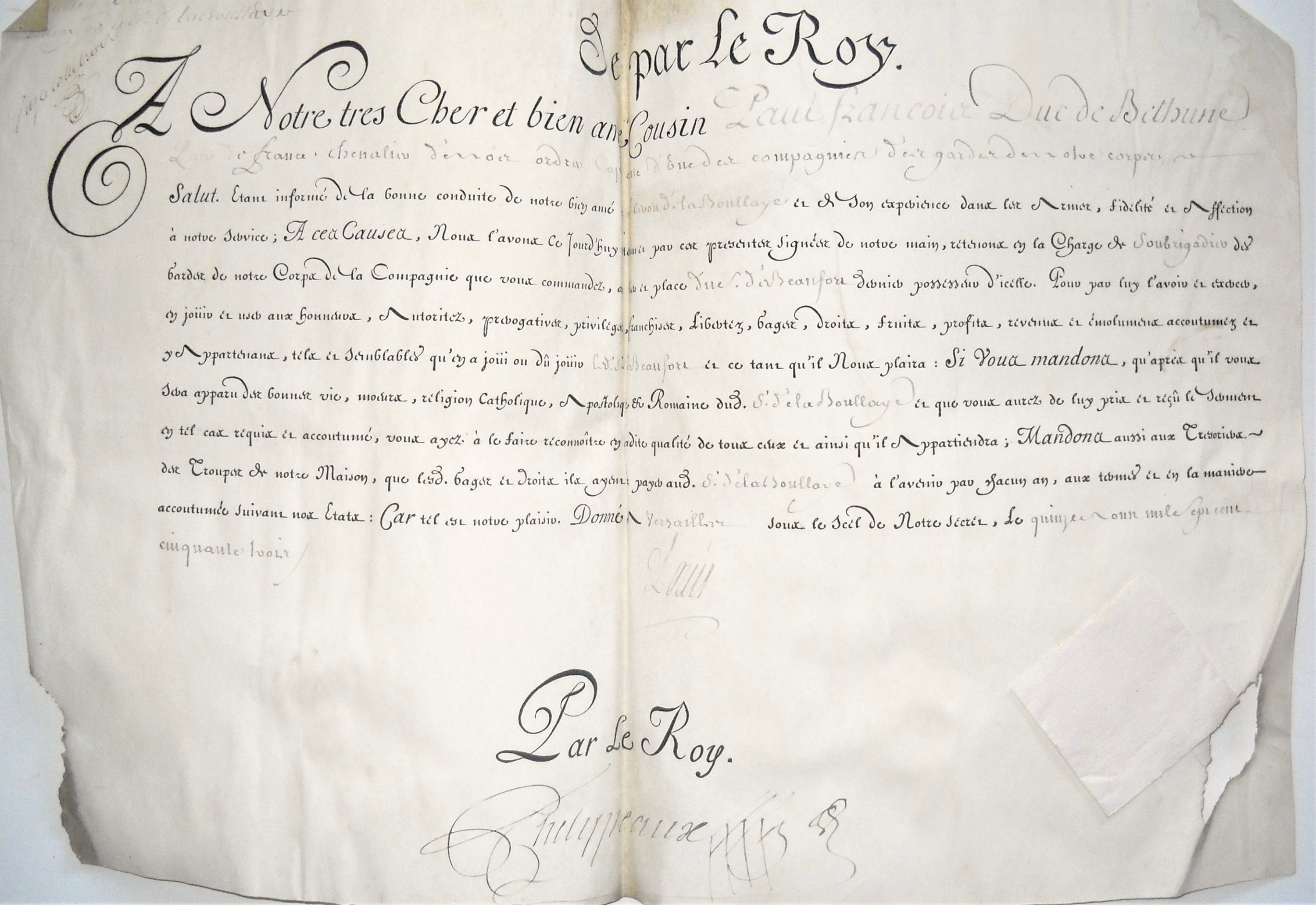 P.S., Paris, 6 juin 1752, Armand Louis marquis de Béthune (1711-1788), maréchal des camps et armée du roi, mestre de camp général de la cavalerie légère de France, parchemin, 25 x 31 cm (petits manques en marge), commission de capitaine de cavalerie délivré à François Jacques Céron sieur de la Boulaye ;
