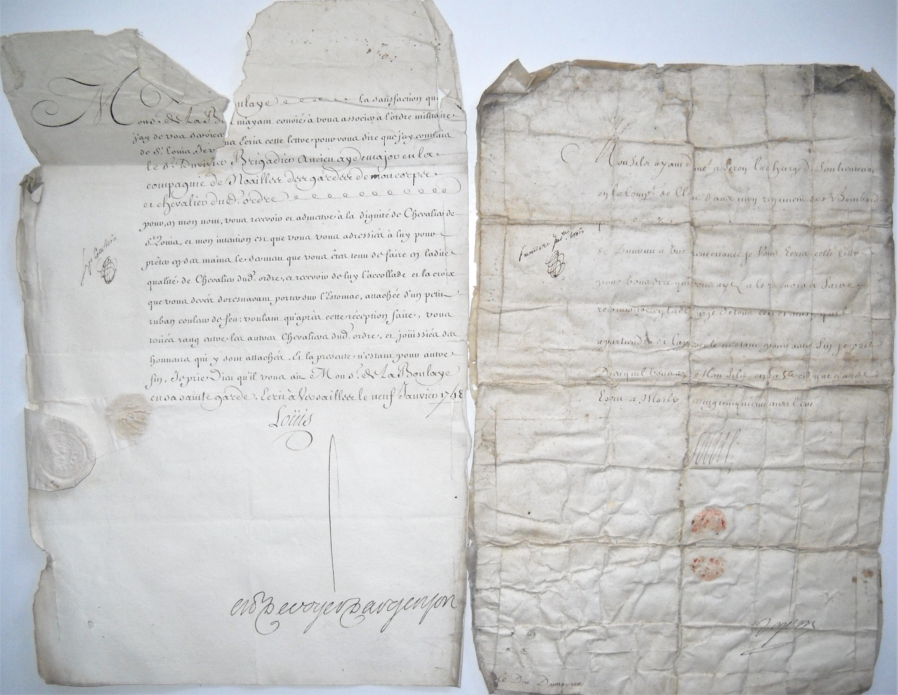 L.S., Versailles, 9 janvier 1748, « Louis » (secrétaire du roi), et contresignée par Marc Pierre de Voyer dArgenson, secrétaire dEtat de la Guerre, 1 page papier in-fol. (déchirures) avec trace de cachet aux armes de France, brevet de retenue de de garde du corps du roi délivré à François Jacques Céron sieur de la Boulaye ;