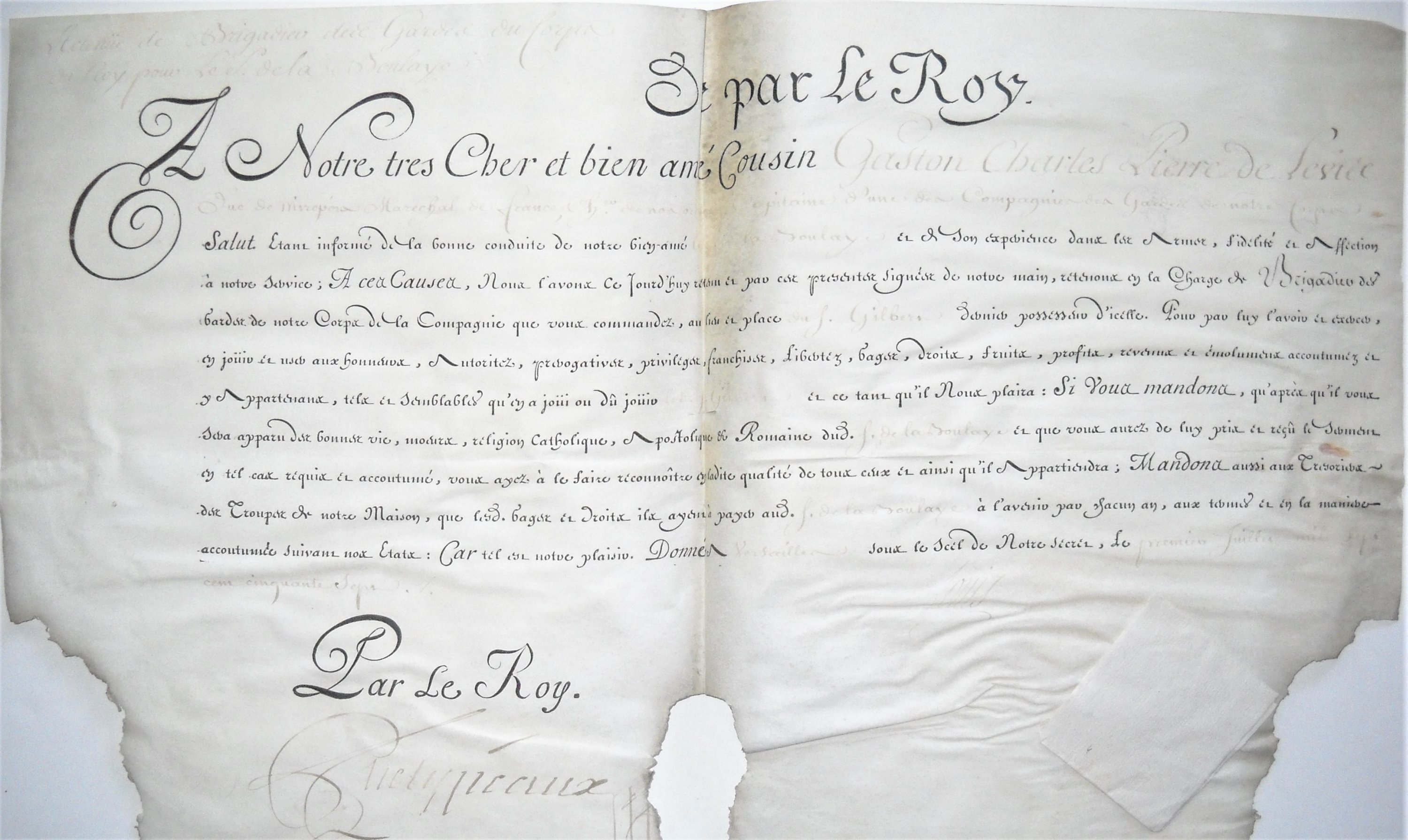 P.S., Versailles, 15 mars 1734, « Louis » (secrétaire du roi), et contresignée par Jean-Frédéric Phélypeaux comte de Maurepas, secrétaire dEtat de la Maison du roi, parchemin oblong avec trace de cachet aux armes de France, admission à la dignité de chevalier de Saint Louis ;