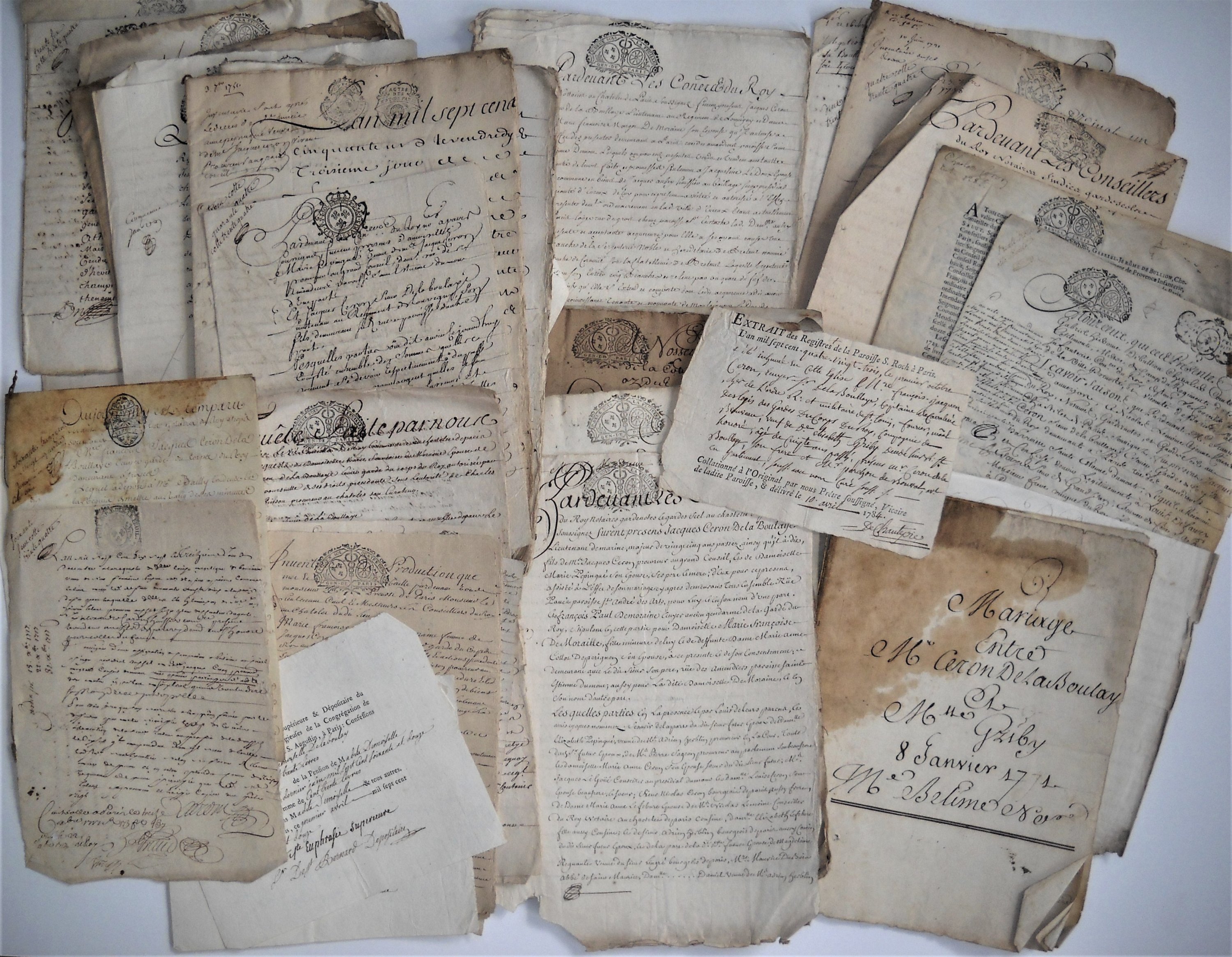 Actes notariés et de justice dont copies des contrats de mariage (1720 et 1771), procédure-enquête de séparation de biens en raison des dettes accumulées par le sieur de la Boulaye ; copie du testament de François-Jacques Céron de la Boulaye (1776) ; arbre généalogique, etc.