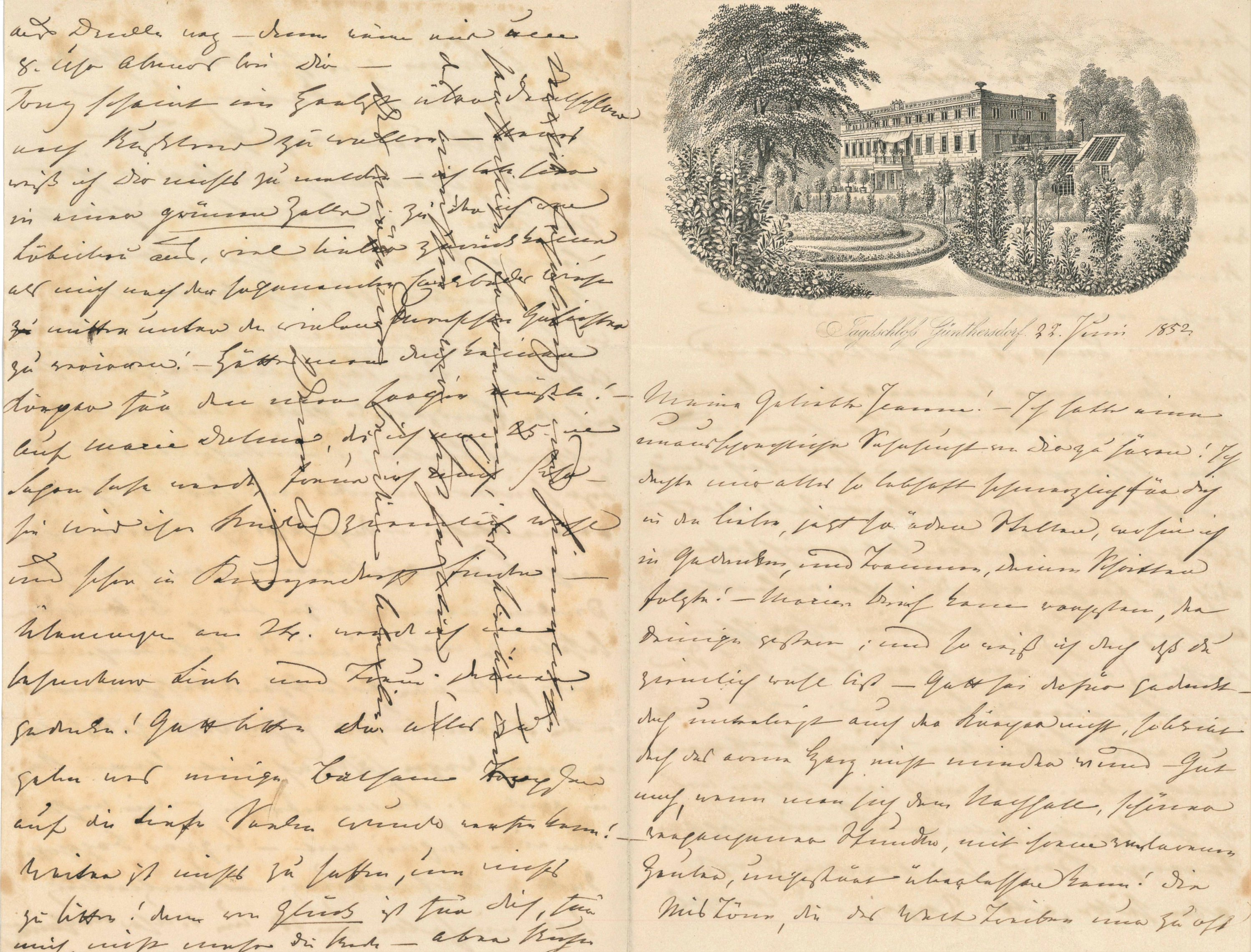 L.A.S., château de Günthersdorf, 22 juin 1852, Dorothée von Biron (1793-1862), princesse de Courlande, duchesse de Dino, Talleyrand et de Sagan, adressée à sa sur cadette Jeanne Catherine von Biron, duchesse dAcerenza ; 4 pages in-8, texte en allemand ;