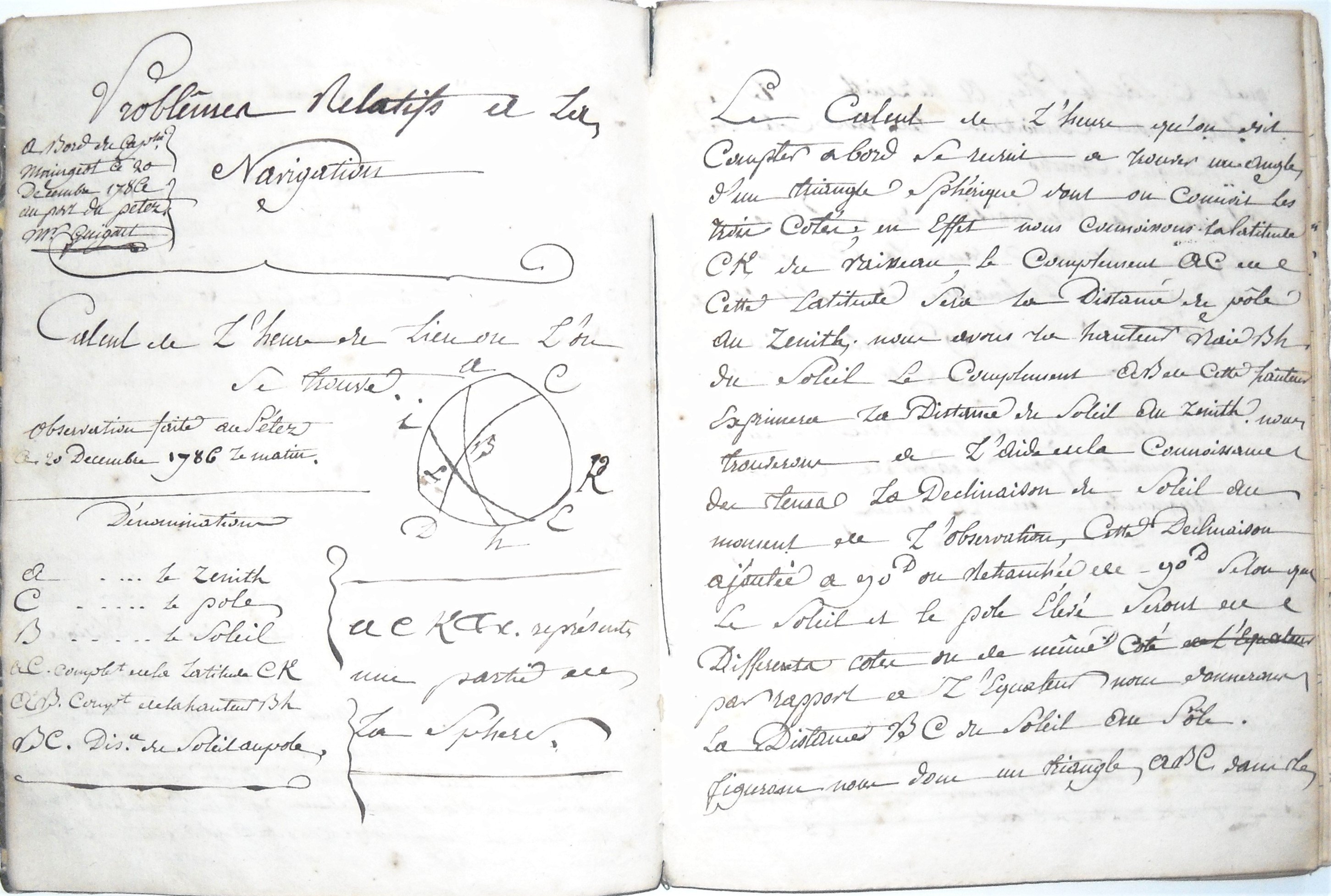 « Diverses propositions et problèmes mathématiques et physiques, recueillis par J. Bte Trécourt, interprète du roi à Seyde », manuscrit relié, env. 74 pages in-4, daté et situé « Ce 28 janvier 1787 à Seyde », contenant des chapitres sur : lalgèbre, Problèmes relatifs à la navigation, Du nombre dor au cycle lunaire, Diverses remarques sur la nature de la lune, son mouvement, etc, Méthode de calcul des principales montagnes qui se trouvent sur la lune, Airométrie, etc.