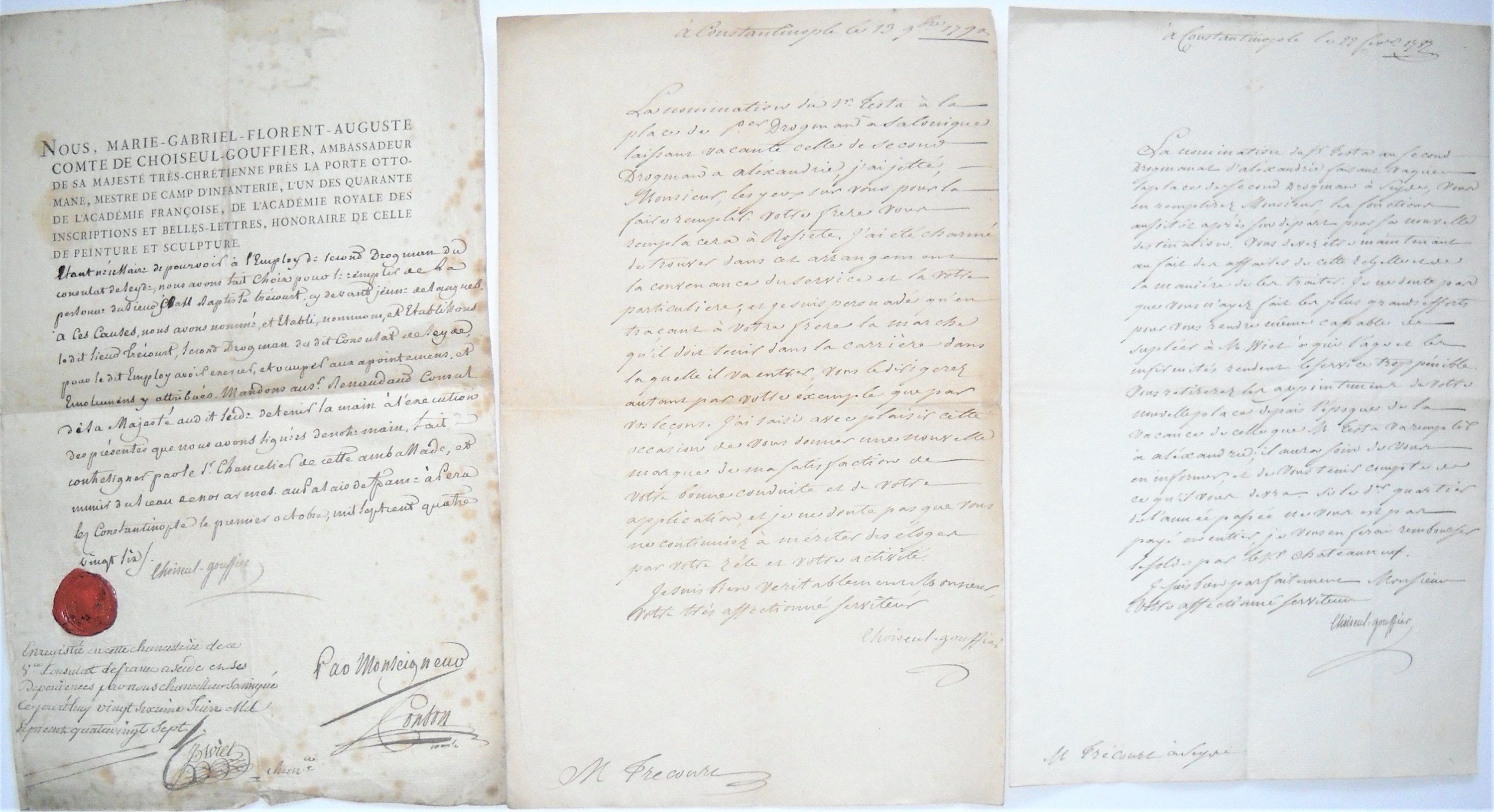L.S., Constantinople, 13 novembre 1790, Marie-Gabriel-Florent-Auguste de Choiseul-Gouffier (1752-1817), ambassadeur du roi de France à Constantinople, 1 page in-fol. ; nomination de Jean-Baptiste Trécourt à la charge de second drogman à Alexandrie, et son frère François Trécourt à celle de Rosette ;