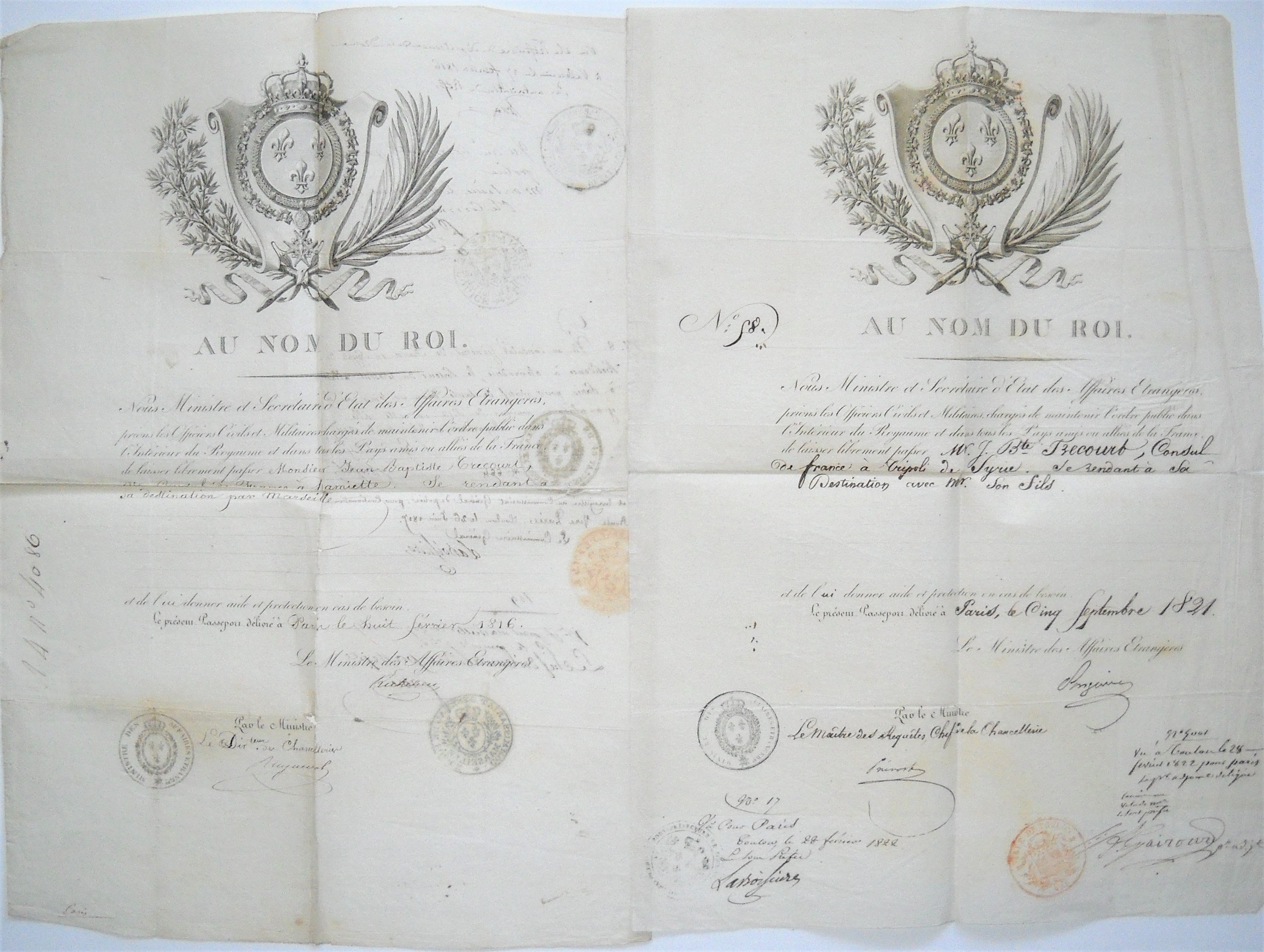 P.S., Paris, 8 février 1816, Armand-Emmanuel du Plessis duc de Richelieu (1766-1822), président du Conseil et ministre des Affaires étrangères, 1 page in-fol. ; passeport de circulation délivré à Jean-Baptiste Trécourt, vice-consul de France à Damiette (Egypte), se rendant à sa destination par Marseille ; P.S., Marseille, 25 mars 1816, Jean Louis César Famin, agent du département des affaires étrangères à Marseille, 1 page in-4 ; Certificat dembarquement de Jean Baptiste Trécourt à bord du navire de commerce le Fortuné à destination dAlexandrie ;