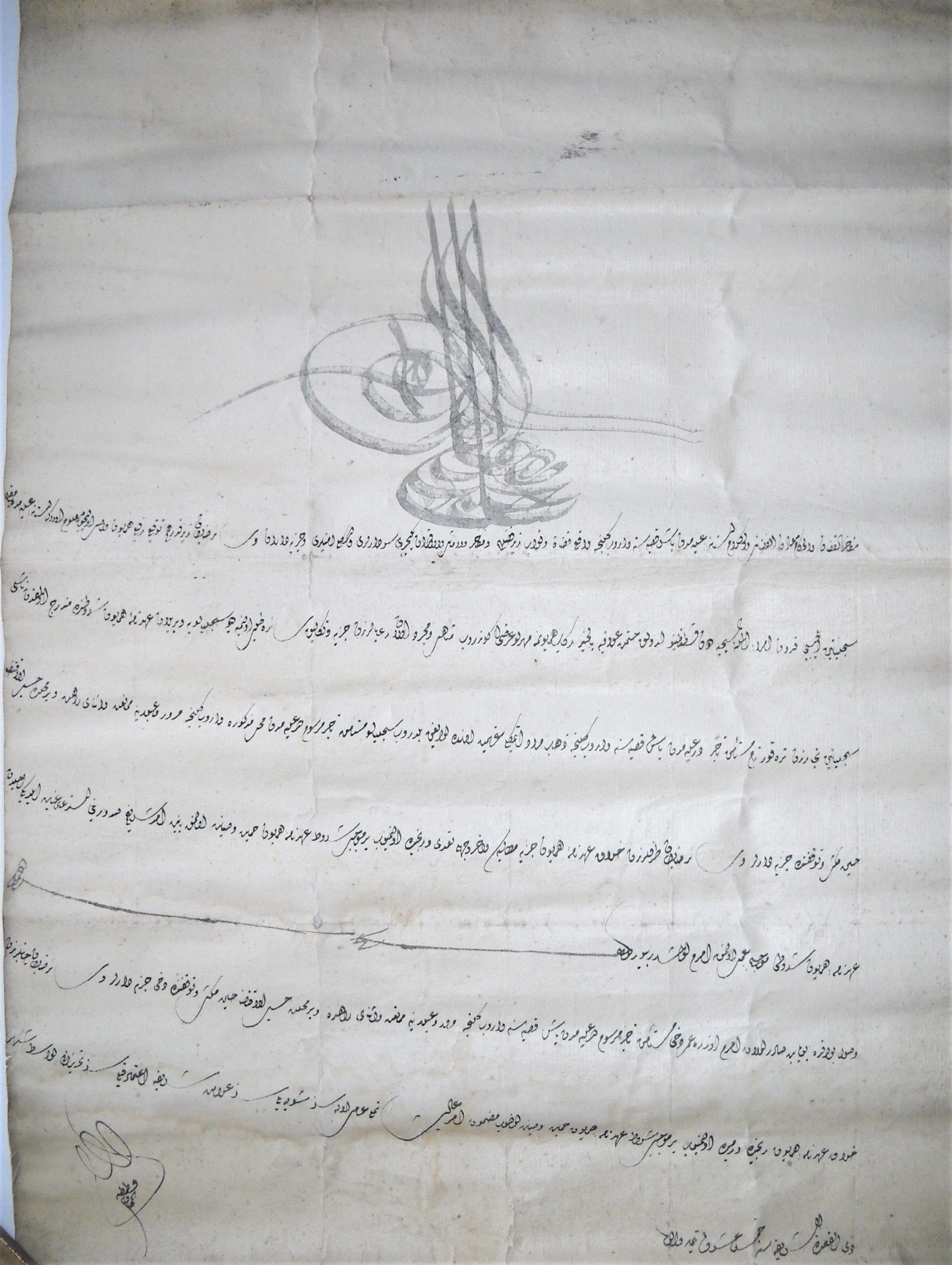 Passeport écrit en ottoman avec tughra (signature) du sultan Sélim III (1789-1807) pour aller de Constantinople jusquen Moldavie par la Mer Noire, 1802, 77 x 54 cm (roulé) ;