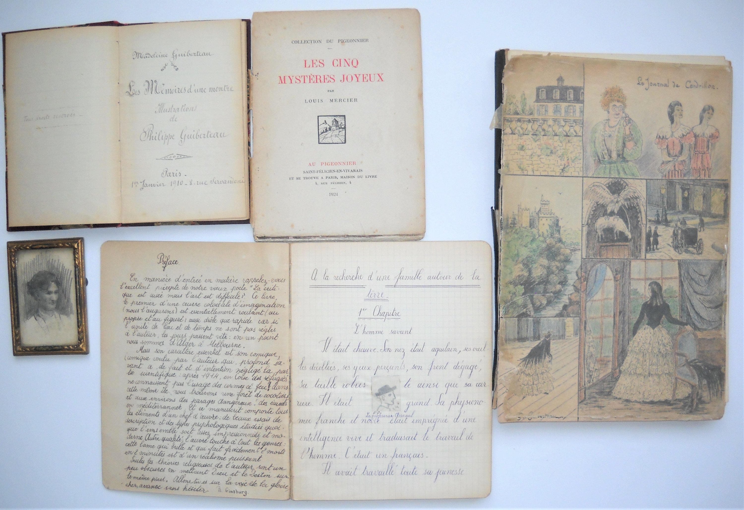 JOINTS : plusieurs dessins aquarellés signés de Germaine Guiberteau ; petit portrait au crayon de Germaine Mauriès-Guiberteau sous cadre, 10 x 7 cm ; « Les cinq mystères joyeux » par Louis Mercier, 1924, plaquette 25 pp. in-8 illustrée par des dessins aquarellés de Germaine Guiberteau ; petit carnet manuscrit 124 pp. in-8 ayant pour titre « Les mémoires dune montre », par Madeleine Guiberteau et illustré par Philippe Guiberteau (enfants de Germaine Guiberteau), daté du 1er janvier 1910 à Paris ; cahier de croquis au crayon ; « A la recherche dune famille autour de la terre », suivi de 17 poèmes, cahier manuscrit 122 pp. in-4 par Rachel Ginsburg, dédié à sa mère Madeleine Guiberteau épouse de Gabriel Ginsburg, 1937-1940.