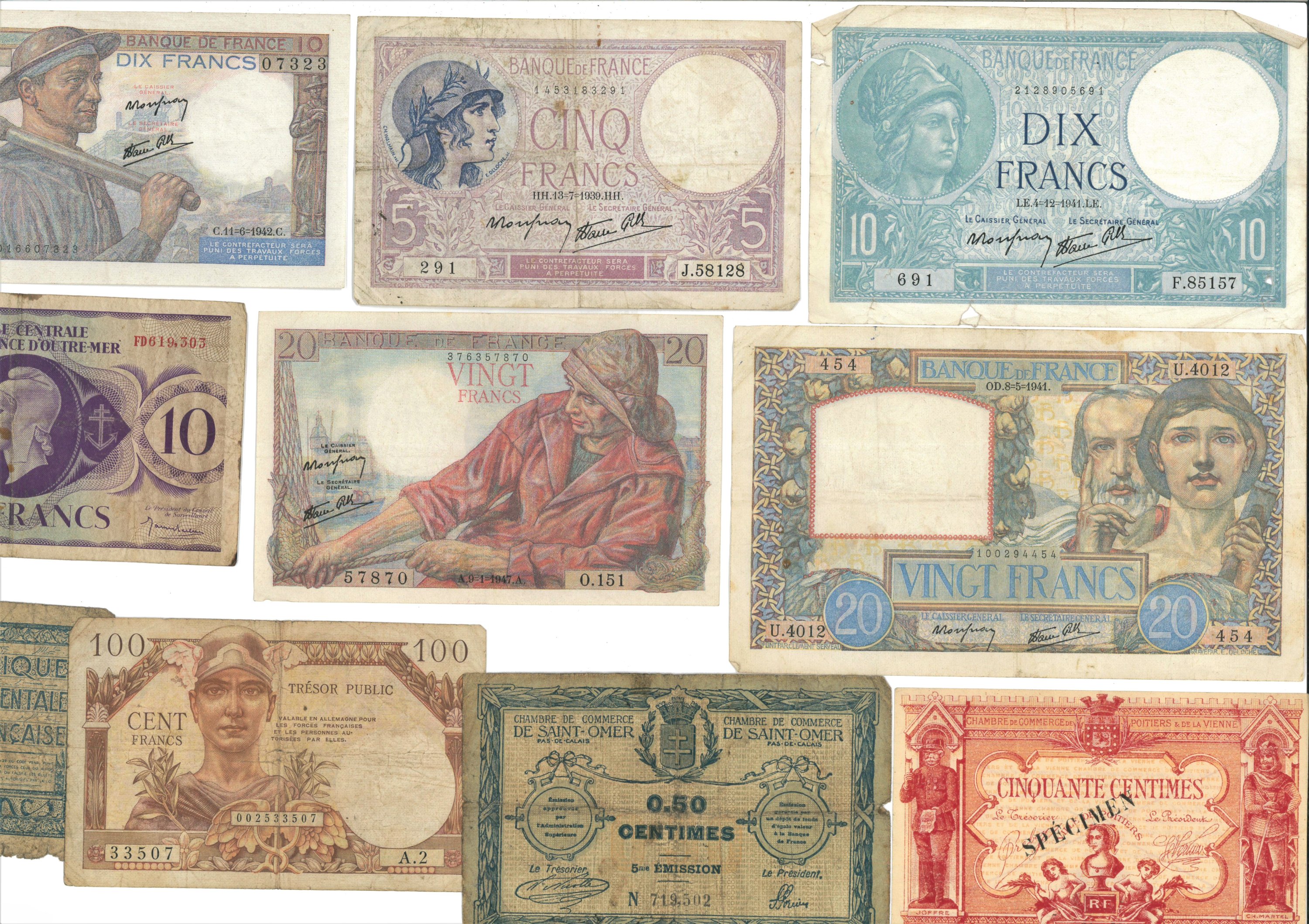 Billets, France : 5 F. femme casquée (1939) ; 3 ex. 10 F. Minerve (1940 et 1941) ; 10 F. mineur (1942) ; 20 F. Science et travail (1941) ; 2 ex. 20 F. pêcheur (1947 et 1948) ; 10 F. Caisse centrale de la France dOutre-Mer ; 50 cts chambre de commerce de Poitier (1915) ; 50 cts chambre de commerce de Saint-Omer ; 2 F. Afrique Occidentale Française ; 100 F. Mercure ;