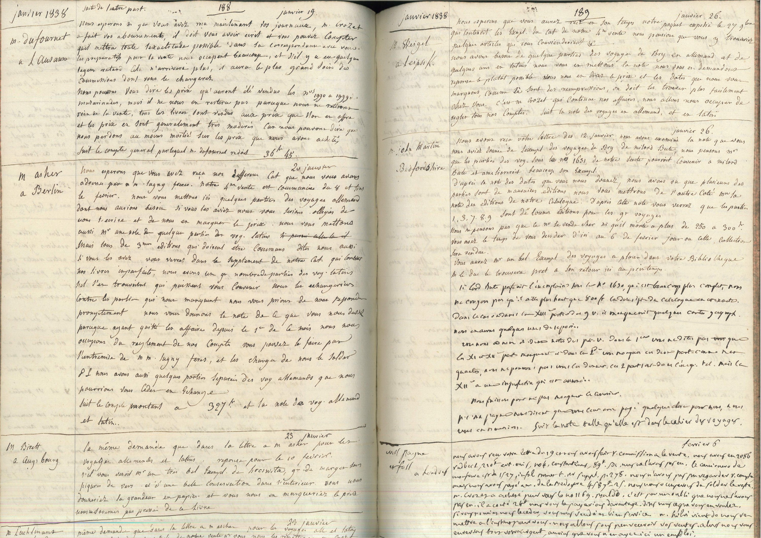Registre manuscrit de copies des correspondances, 267 pp. grand in-4, écrites par Jean-Jacques (1765-1853) et Marie-Jacques De Bure (1767-1857), commissionnaires-libraires, adressées à leur clientèle, entre novembre 1835 et décembre 1846. Suivi d'une indexation alphabétique par noms de clients.