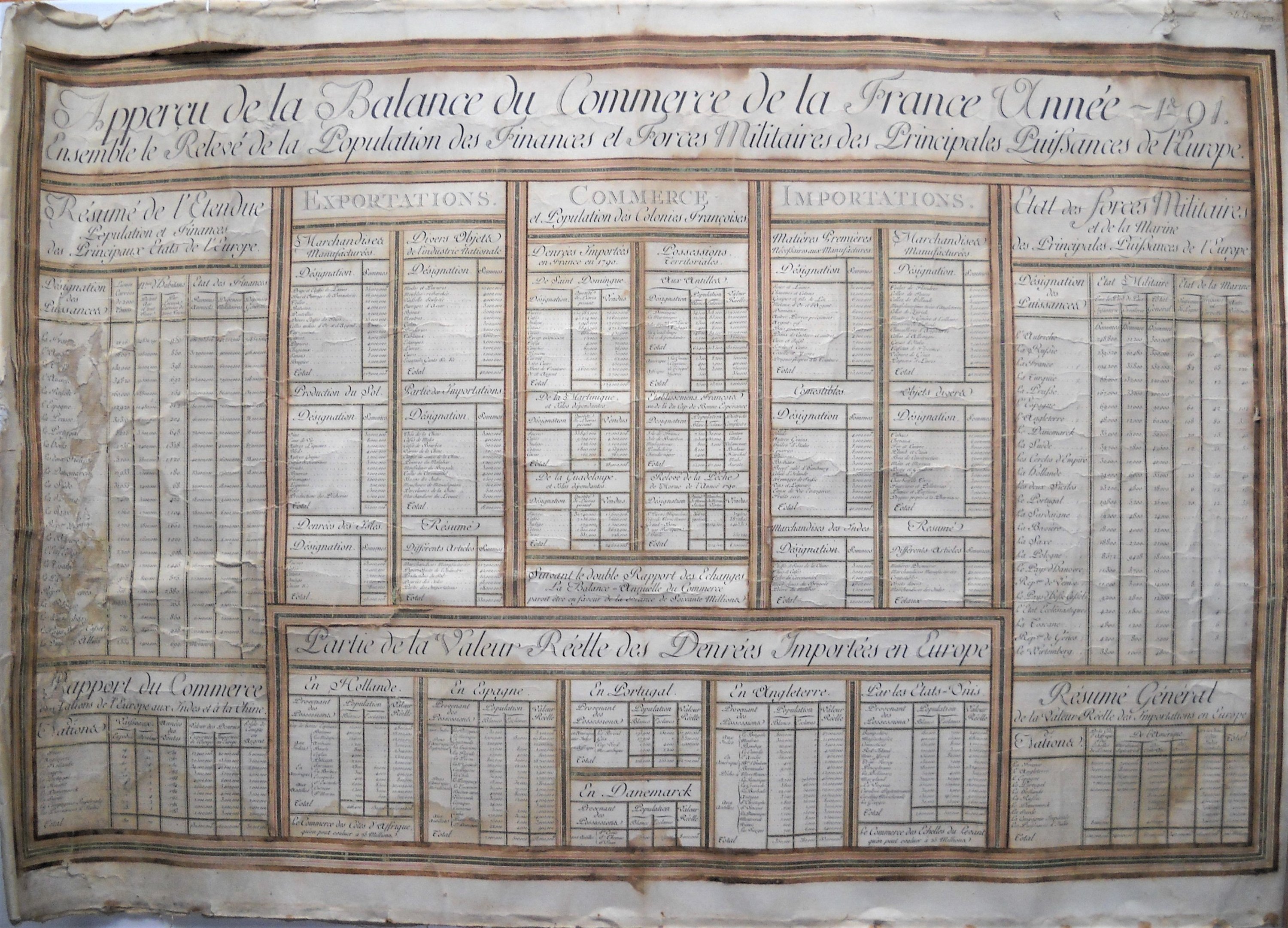 JOINT : Aperçu de la balance du commerce de la France - année 1791 - Ensemble le relevé de la population, des finances et forces militaires des principales puissances de l'Europe, imprimé in-plano, env. 65 x 99 cm (en létat), contrecollé sur toile ; Veduta del ponte Salario , par Giovanni Battista Piranesi, eau-forte sur papier vergé, vers 1750, 52 x 76 cm (accdts) ; imagerie dEpinal : planche de jeu de loie et 14 planches dhistoriettes (en létat).