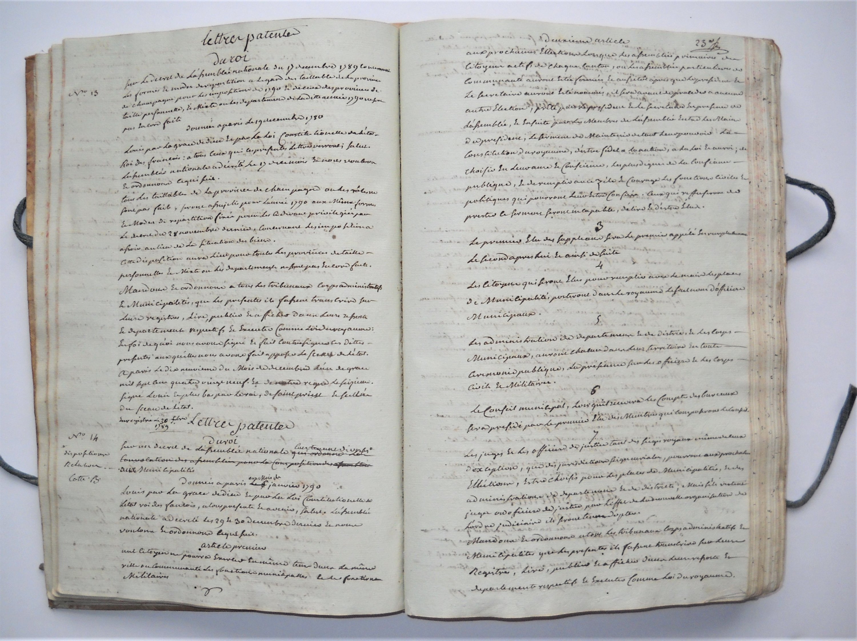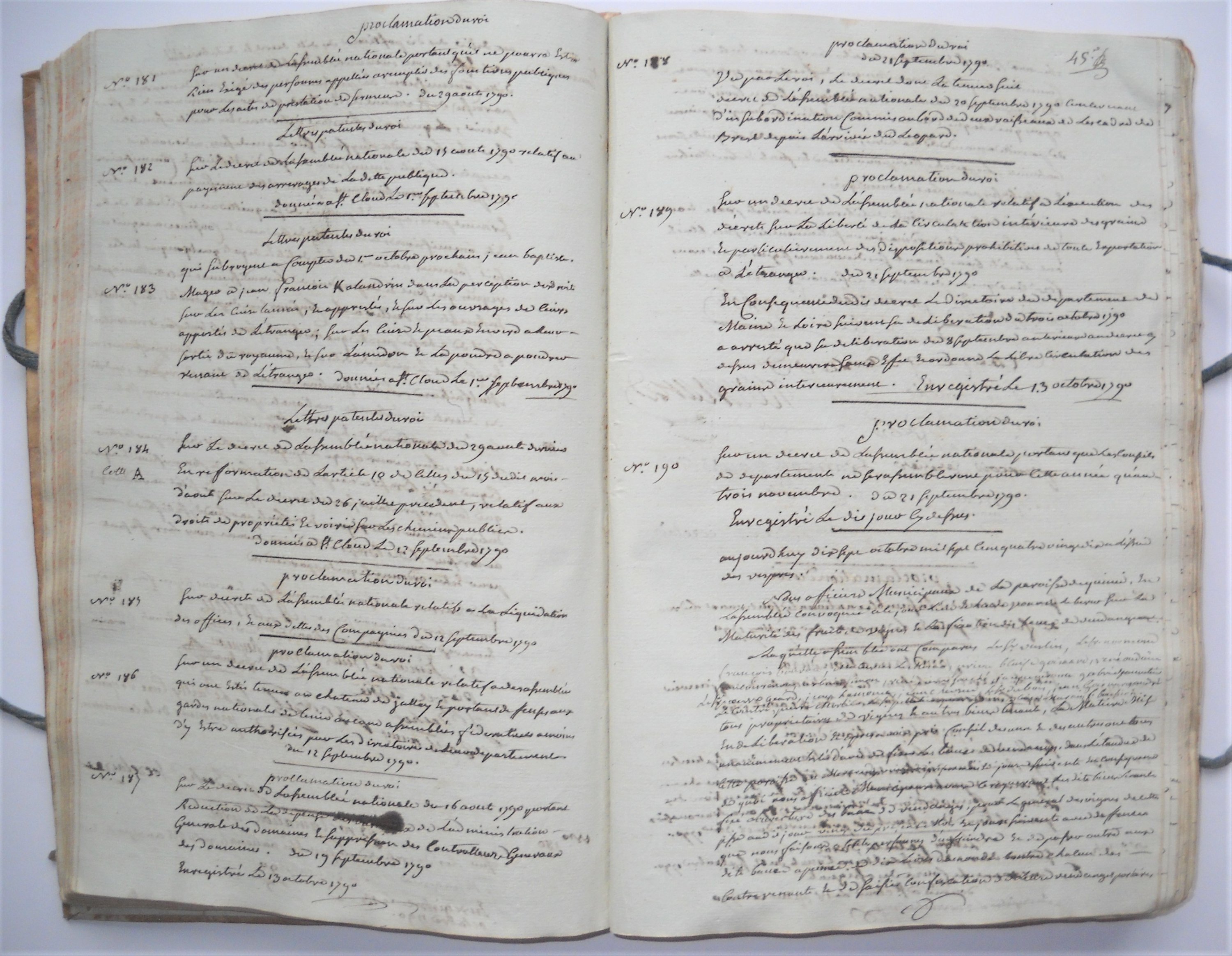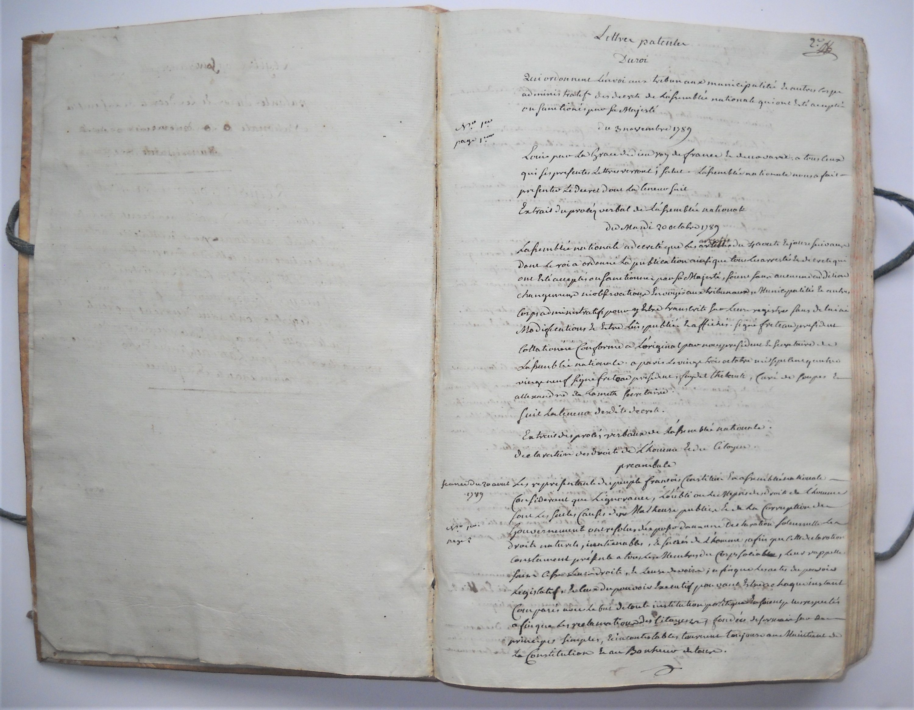 Registre manuscrit 288 pp. in-fol. intitulé « Registre où sont transcrites les lettres patentes du roi et les décrets de lassemblée nationale sanctionnée par Sa Majesté » du 3 novembre 1789 au 3 août 1793.