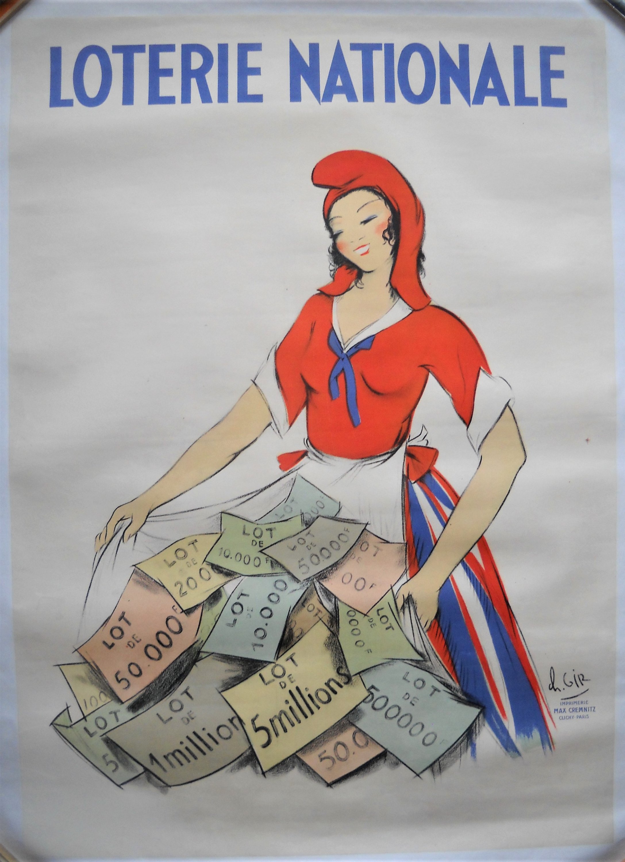 « Loterie Nationale ». Signée. [1936]. Epreuve originale imprimée en couleurs. « Max Cremitz Paris ». Entoilée, 112 x 79 cm. Bel état.