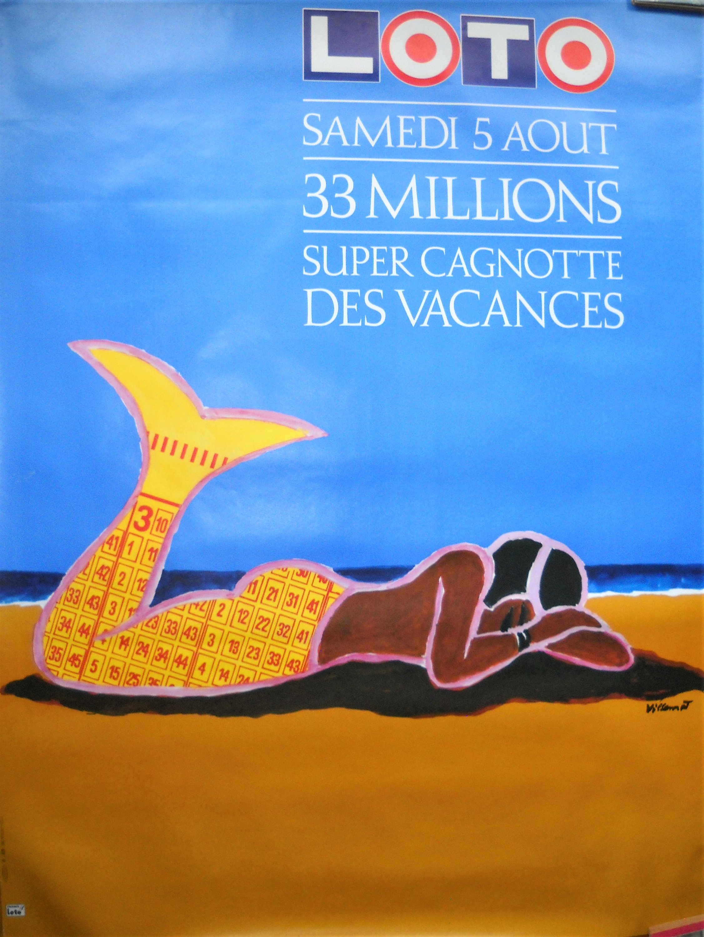 « Loto / Samedi 5 août / 33 millions / Super cagnotte des vacances ». Signée. 1989. Epreuve originale imprimée en couleurs. Non entoilée, 155 x 115 cm, bel état.