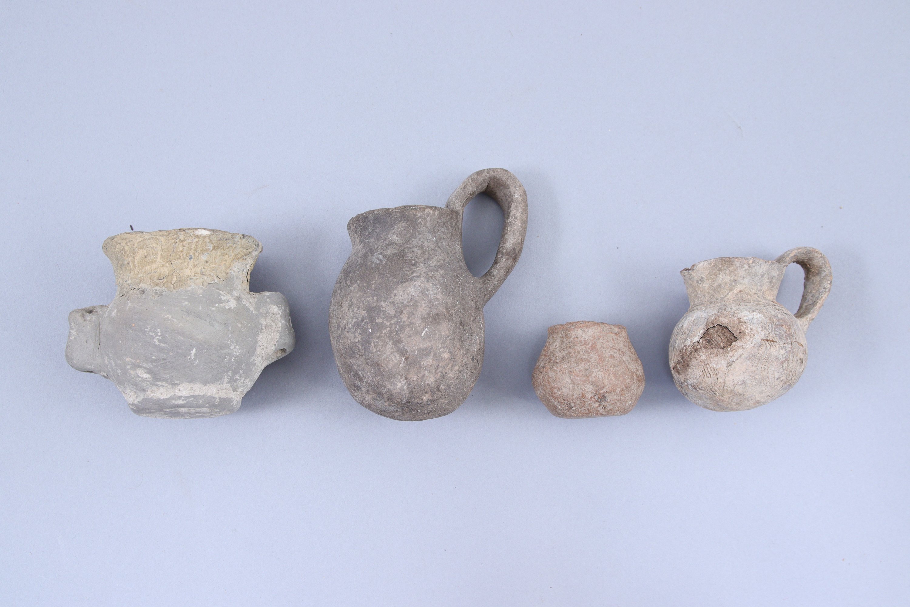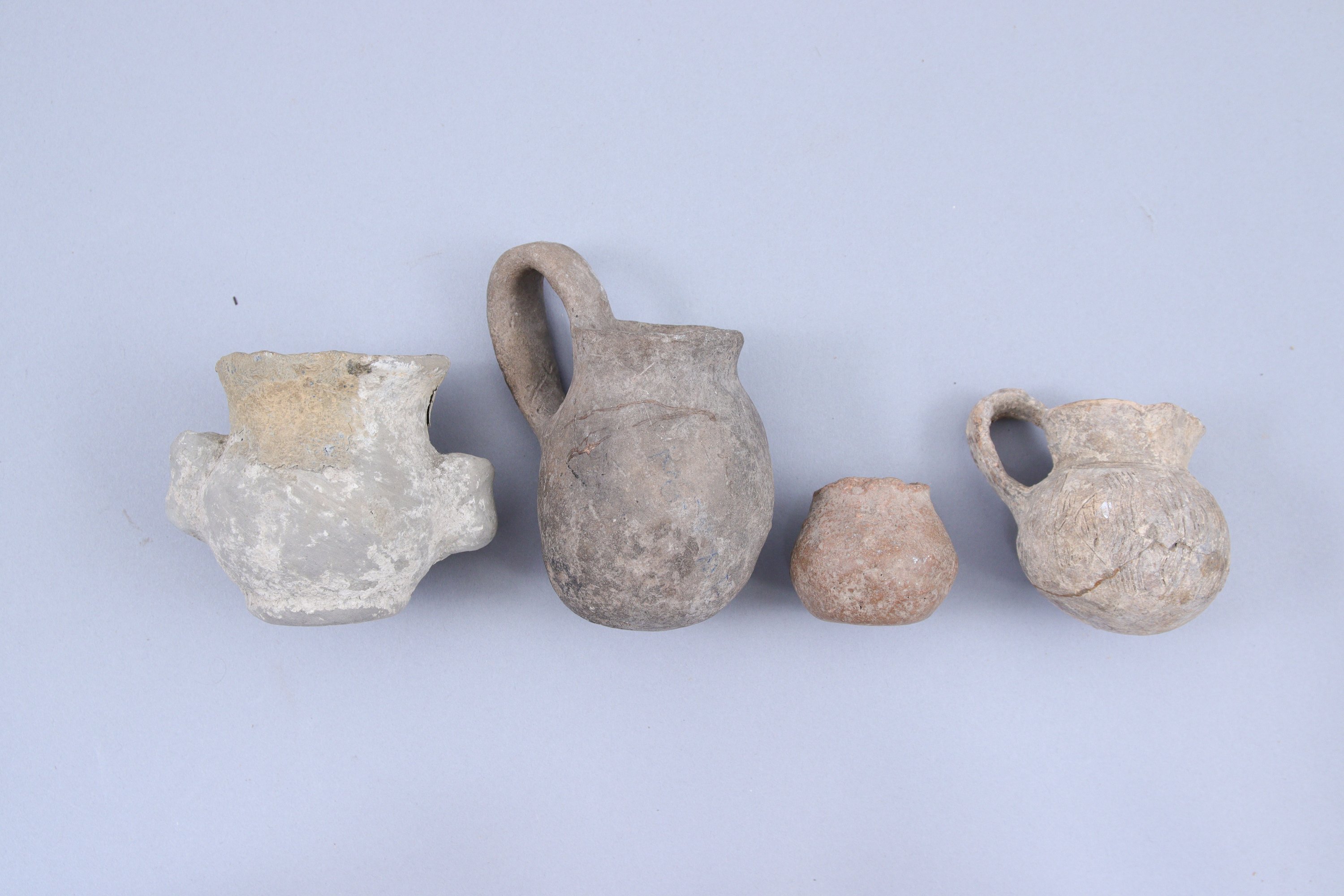 - Deux petits vases en céramique modelée, le plus grand avec une anse. Haut. max. 10,5 cm. (col manquant au petit vase)