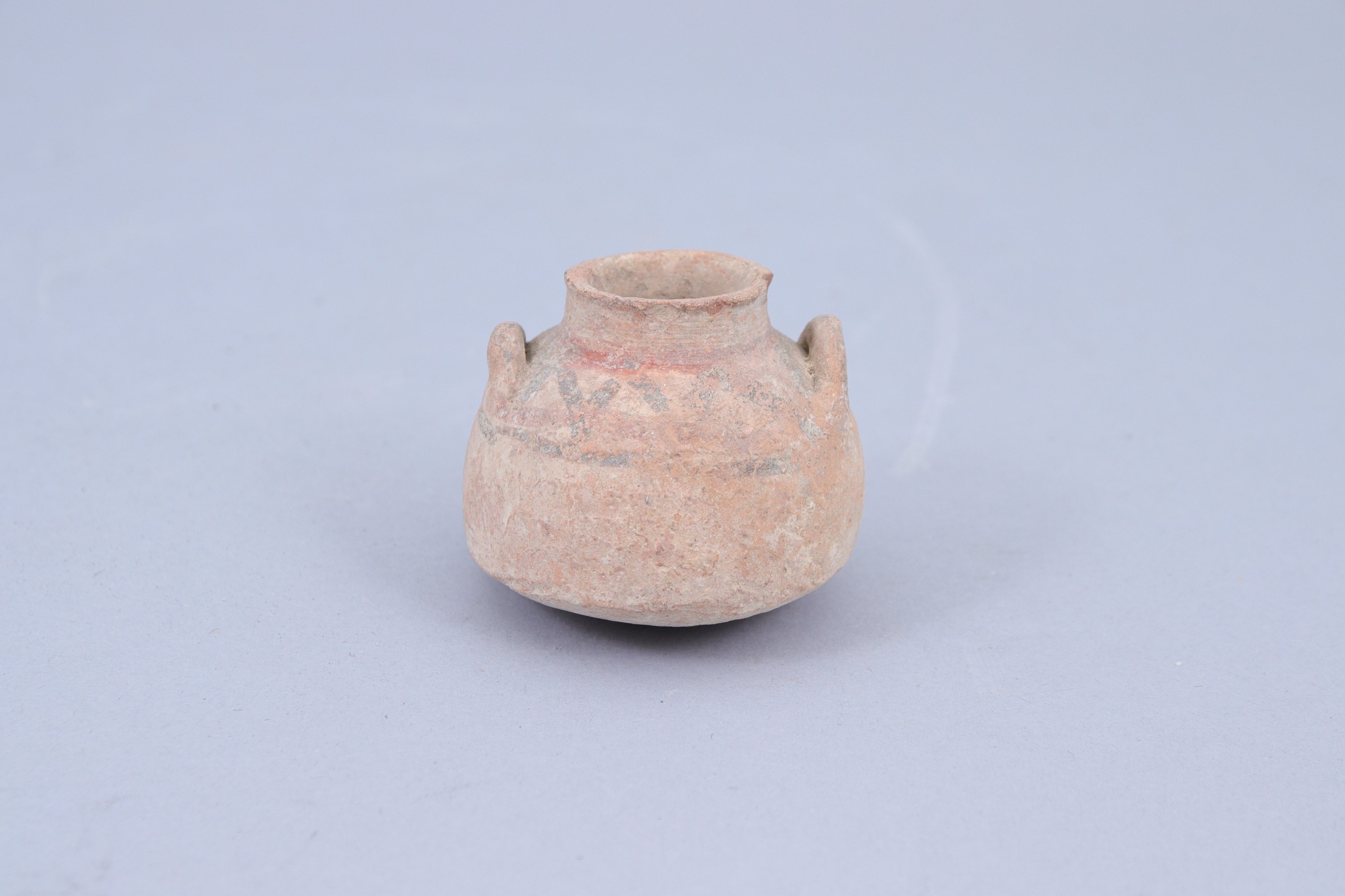 Joint : Chypre ? c. IIe millénaire av. J.-C. Petit vase en céramique à engobe rouge décoré de lignes et points noirs. Haut. 3,5 cm.