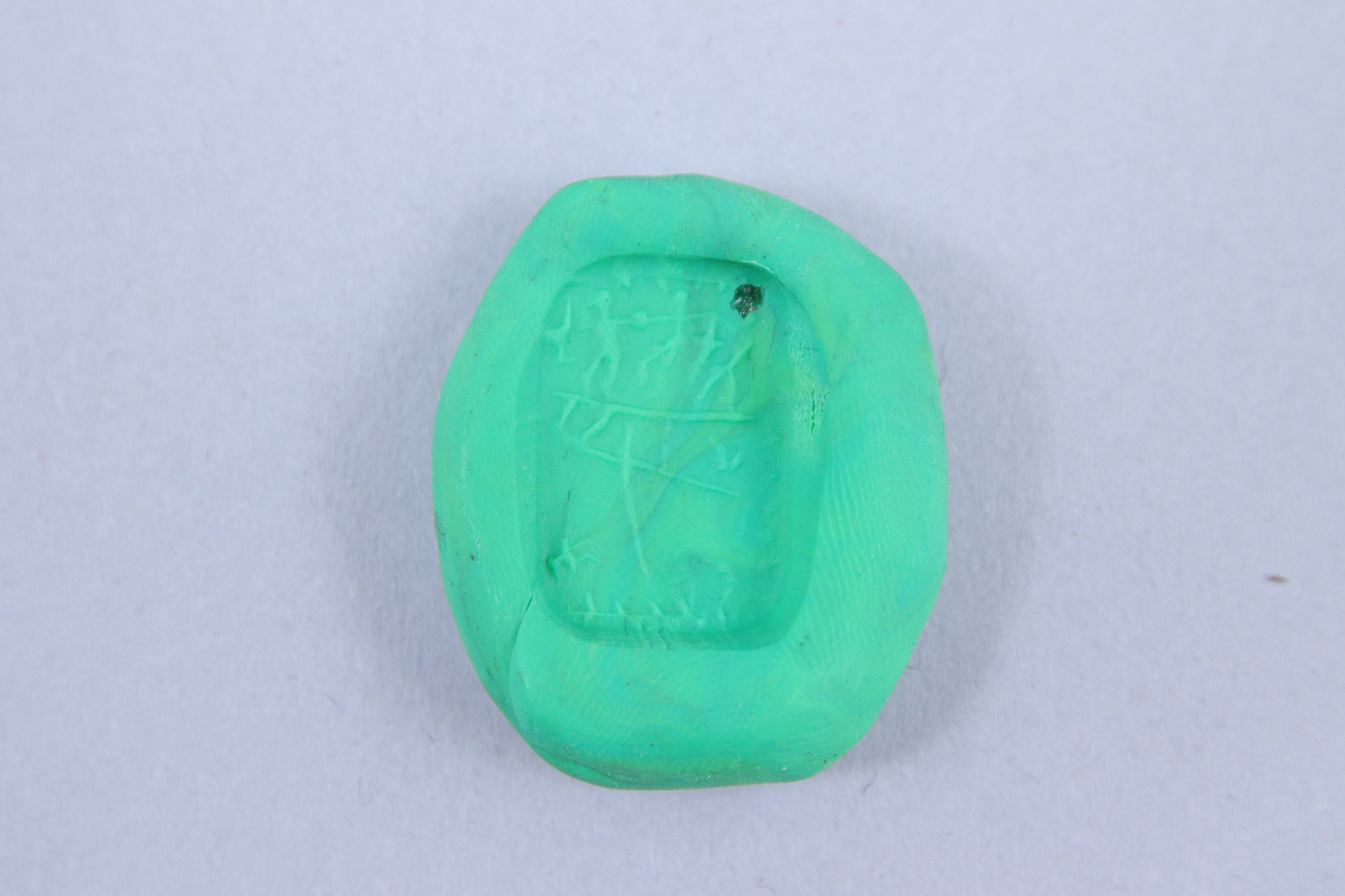 en pierre translucide verte, dont lempreinte figure trois personnages stylisés (sur un bateau ?).