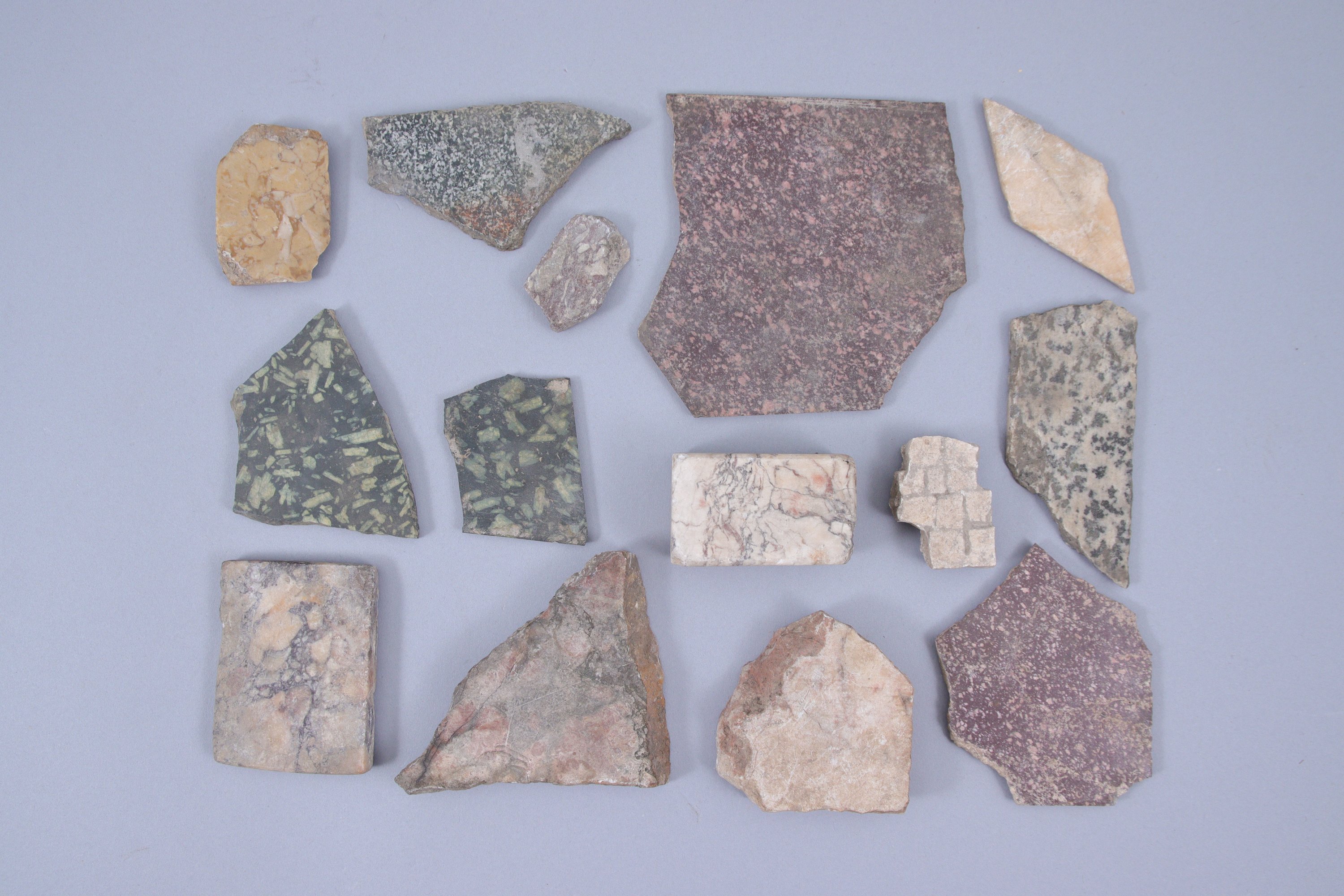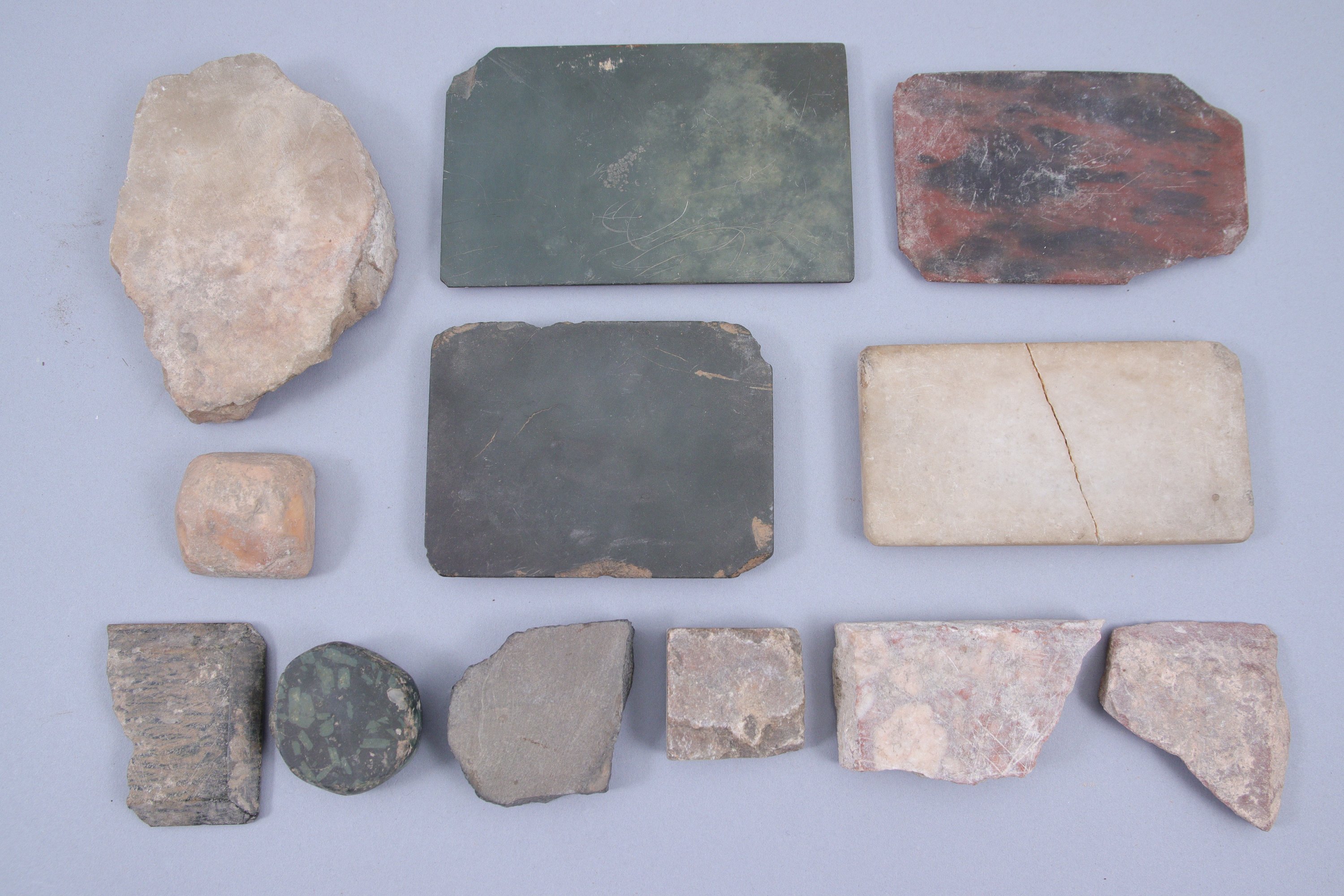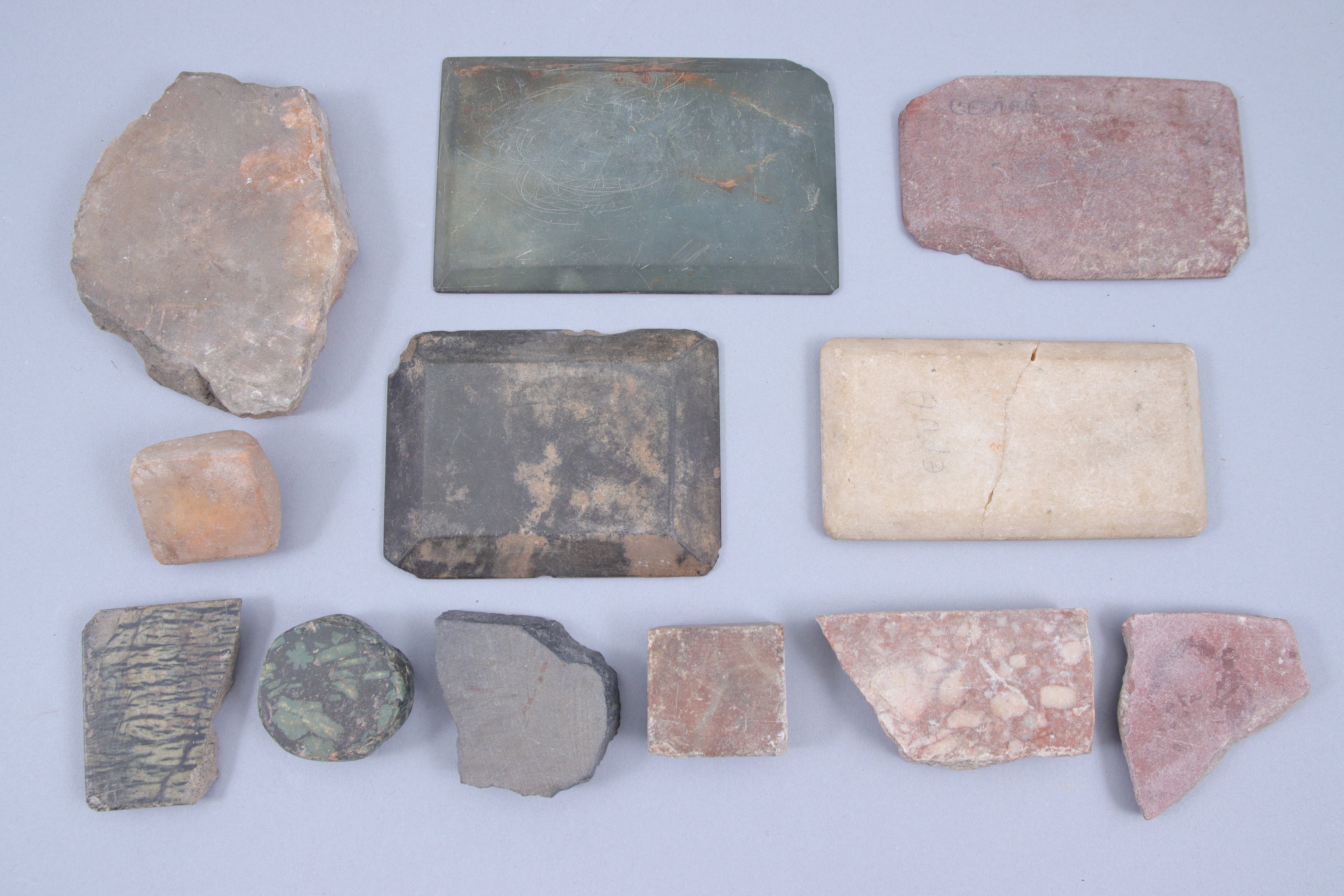 - Palette à fard (Long. 10,5 cm) et un fragment en pierre verte, auxquels on joint 20 fragments de marbre et pierres colorées (placage, etc. dont deux comportant une inscription au crayon) et un morceau de mosaïque.