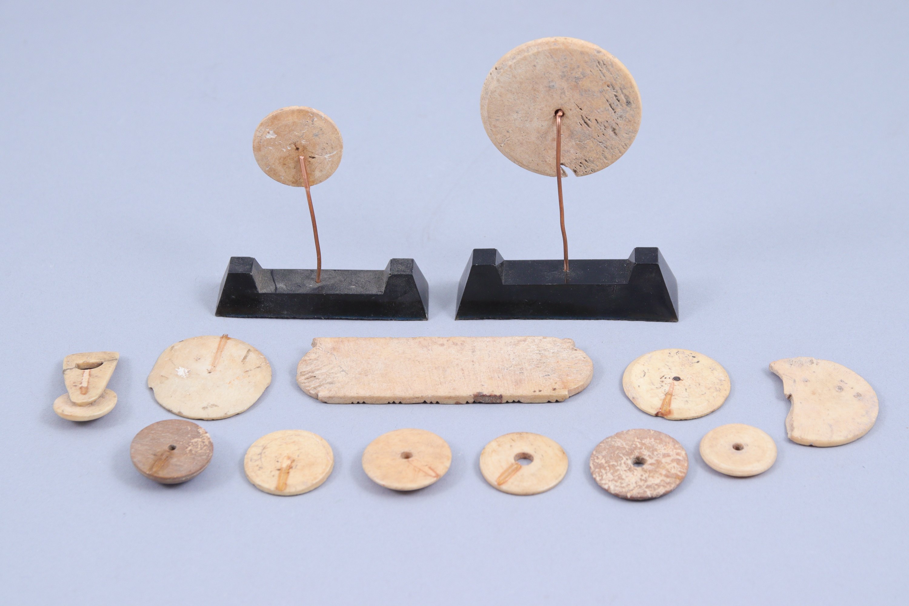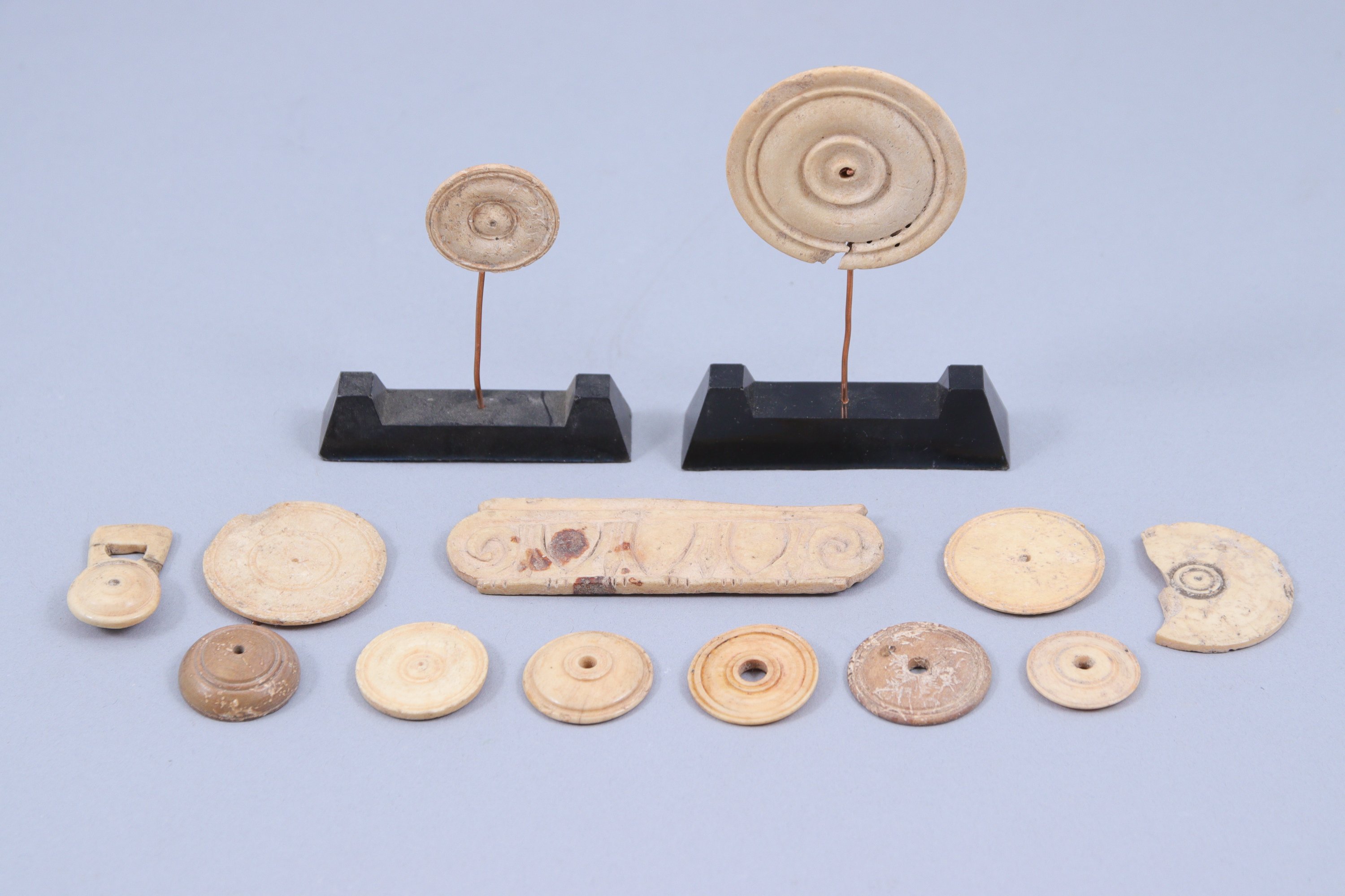 Joints : 11 disques en os décorés de cercles concentriques en relief. Probablement Smyrne ou ses environs, période romaine. Au revers, les bords sont généralement biseautés, sauf pour l'un, accidenté, présentant le motif dun triangle incisé et décoré à lintérieur de lignes croisées. (accidents et manques) Diam. max. 5 cm.