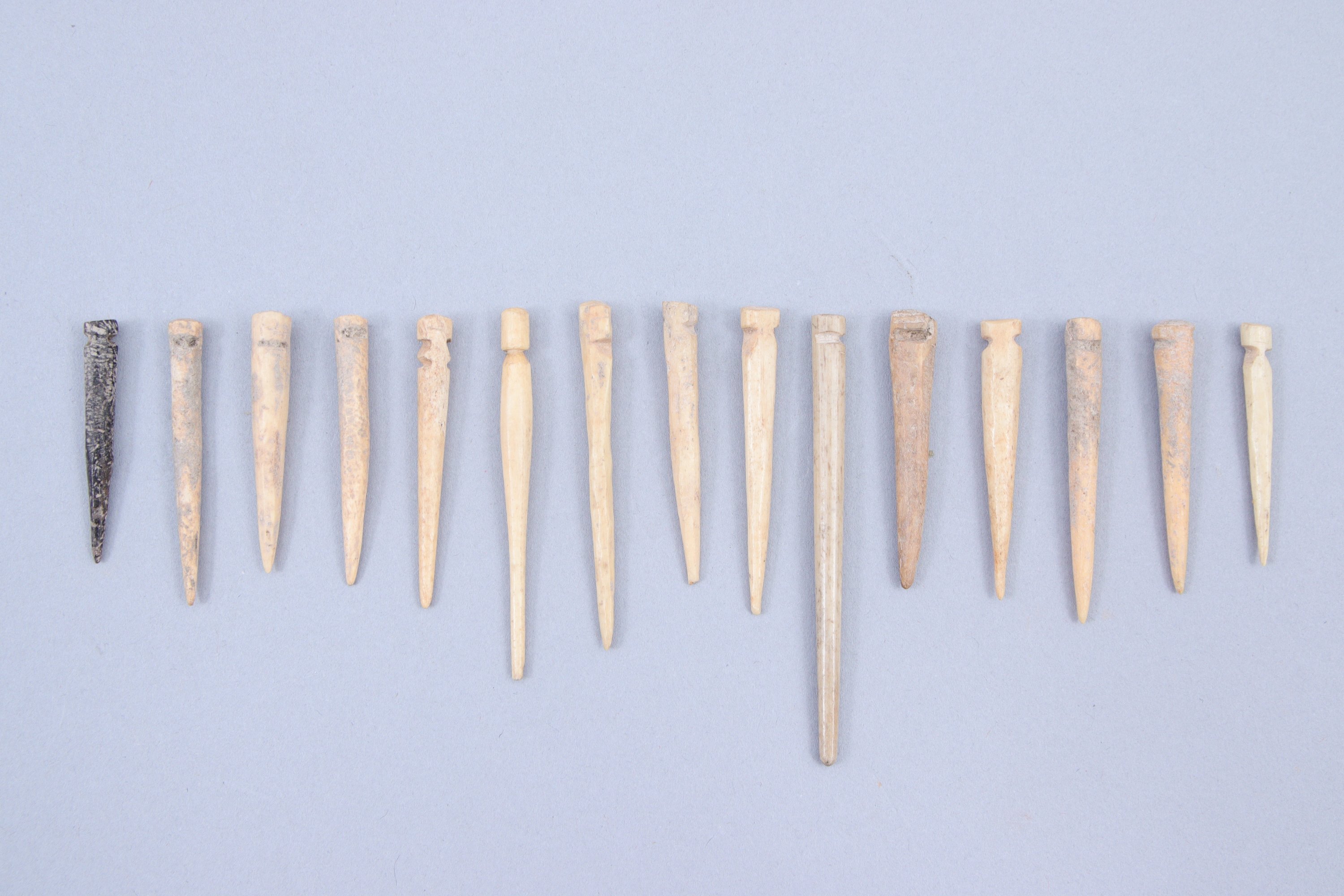 - 15 ustensiles coniques avec des entailles à la grande extrémité (pour fixer les cordes dun instrument de musique ?). Long. max. 8 cm.