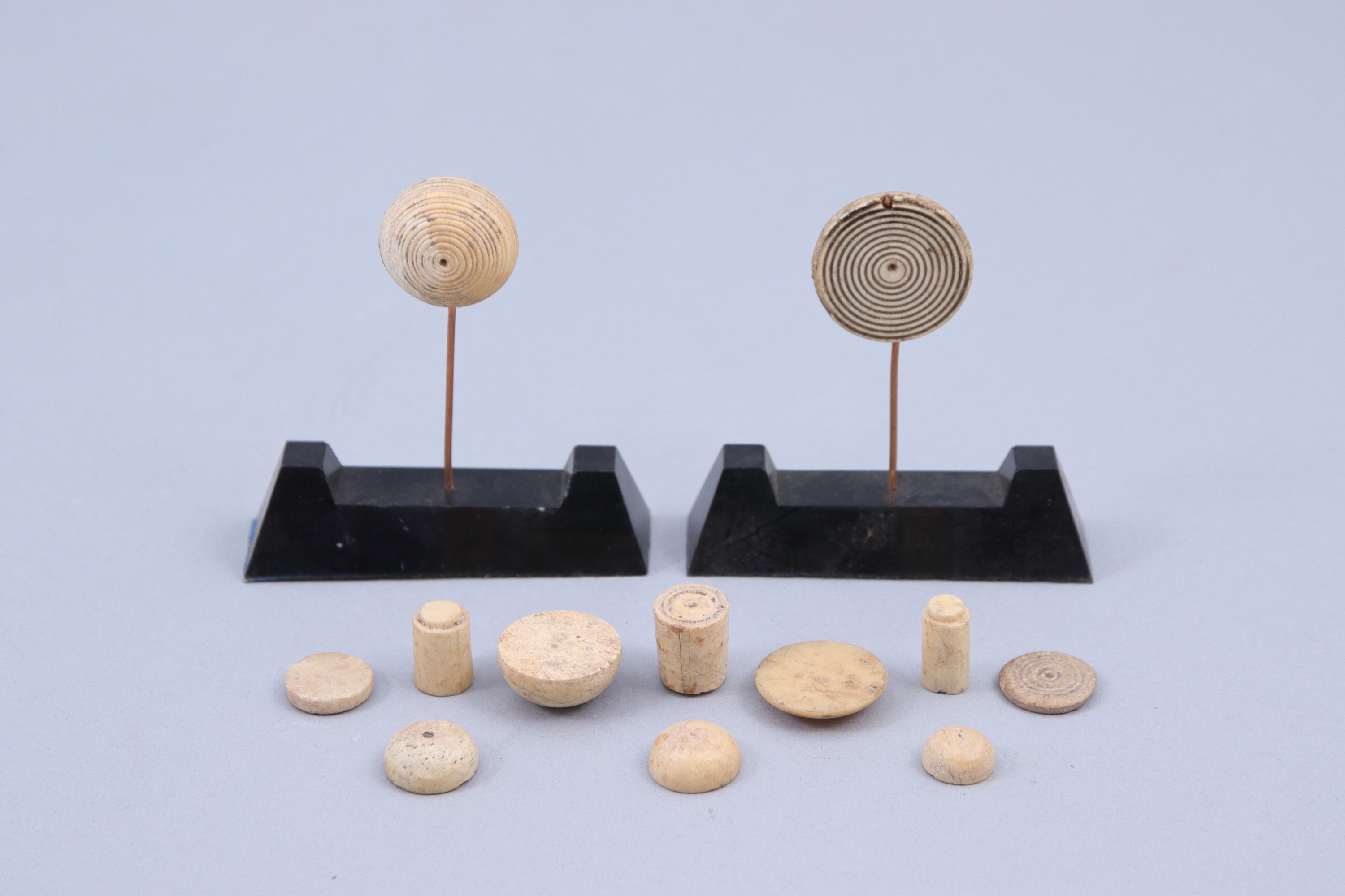 - 12 pions de jeu romains, certains ornés de cercles concentriques. Diam. max. 3 cm.