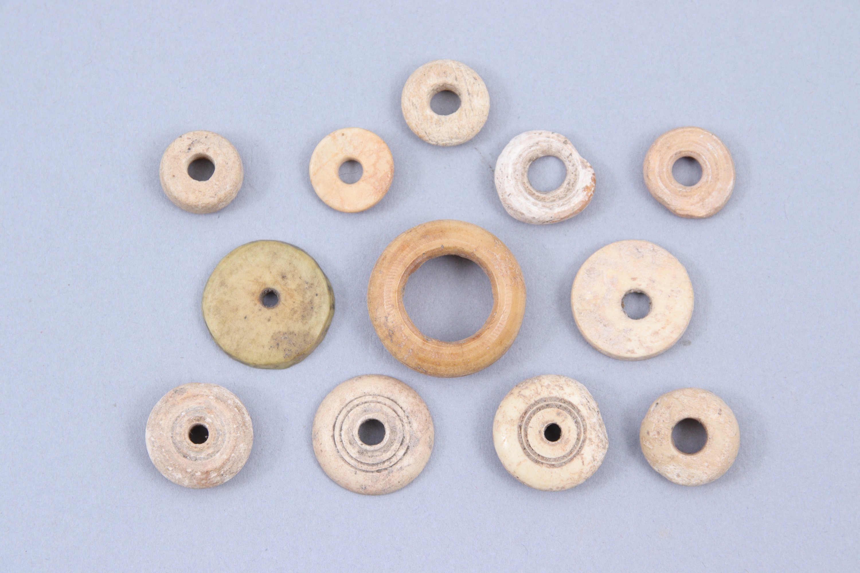 - 12 perles et anneaux en os et coquillage. Deux portent une inscription grecque au crayon indiquant "KLAZO", renvoyant probablement au site de Clazomènes, proche de Smyrne. Diam. max. 2,5 cm.