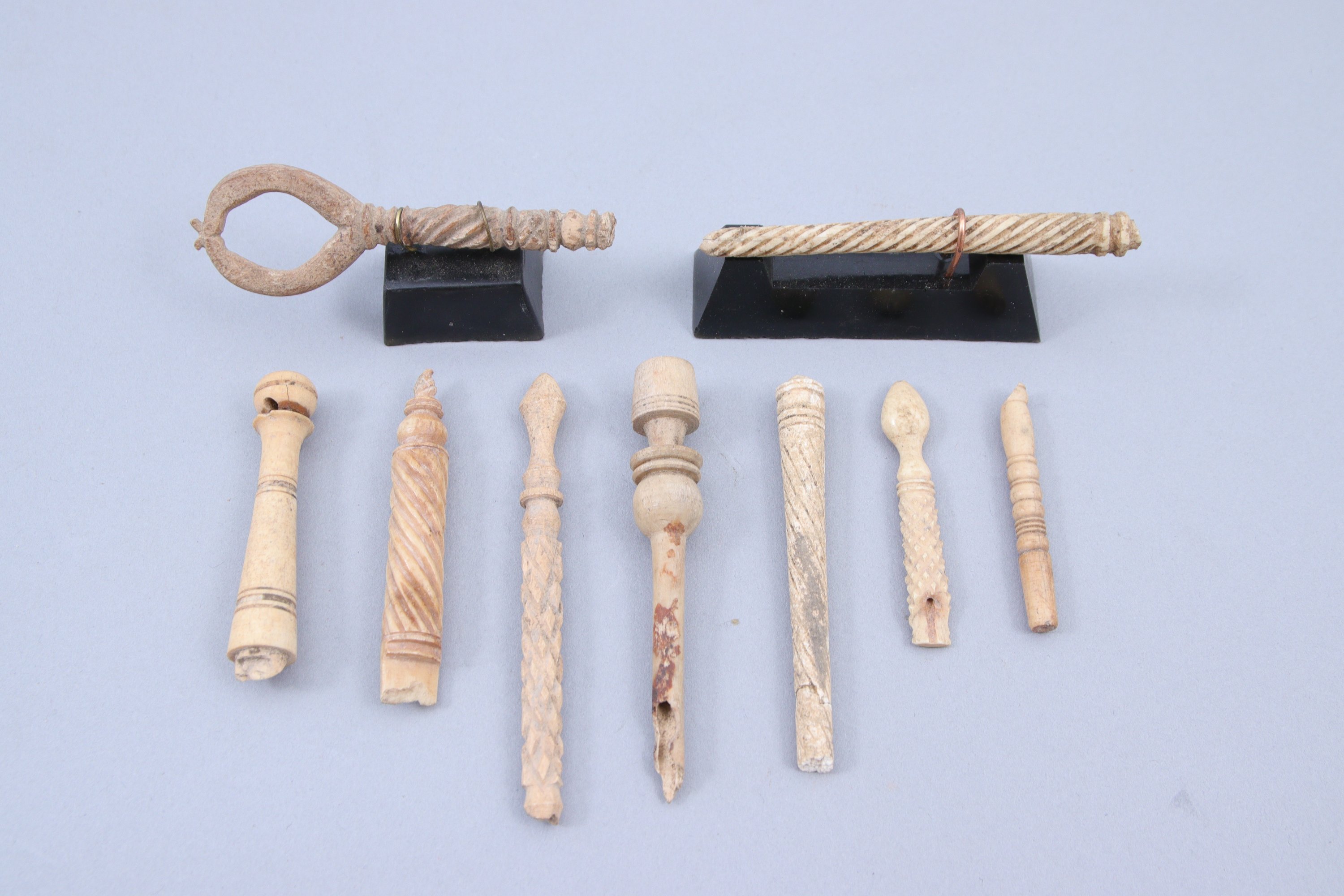 - 8 manches cylindriques dustensiles romains en os décoré de torsades, etc. On leur joint un tube à décor tourné (embouchure de narguilé ottoman ?). Long. max. 9,5 cm.