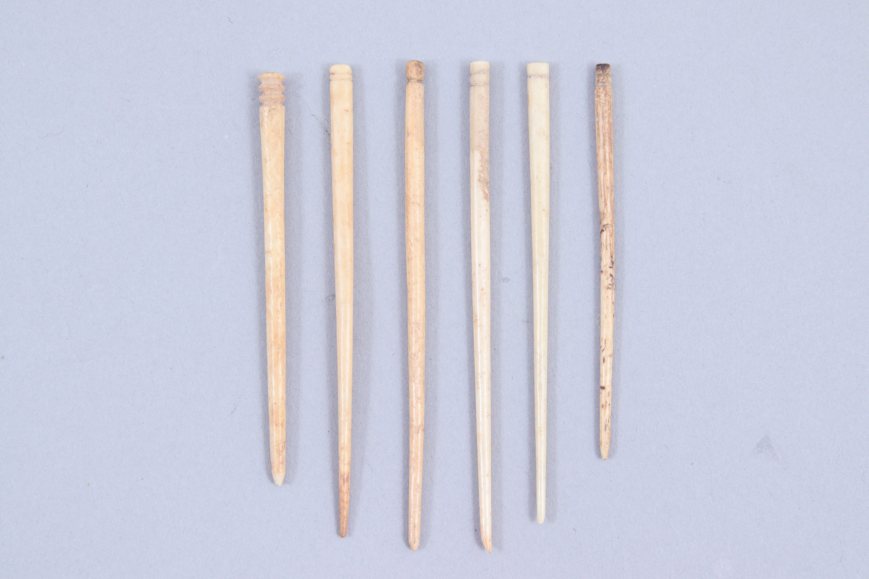 - 6 épingles romaines à tête striée. Long. max. 9,5 cm.
