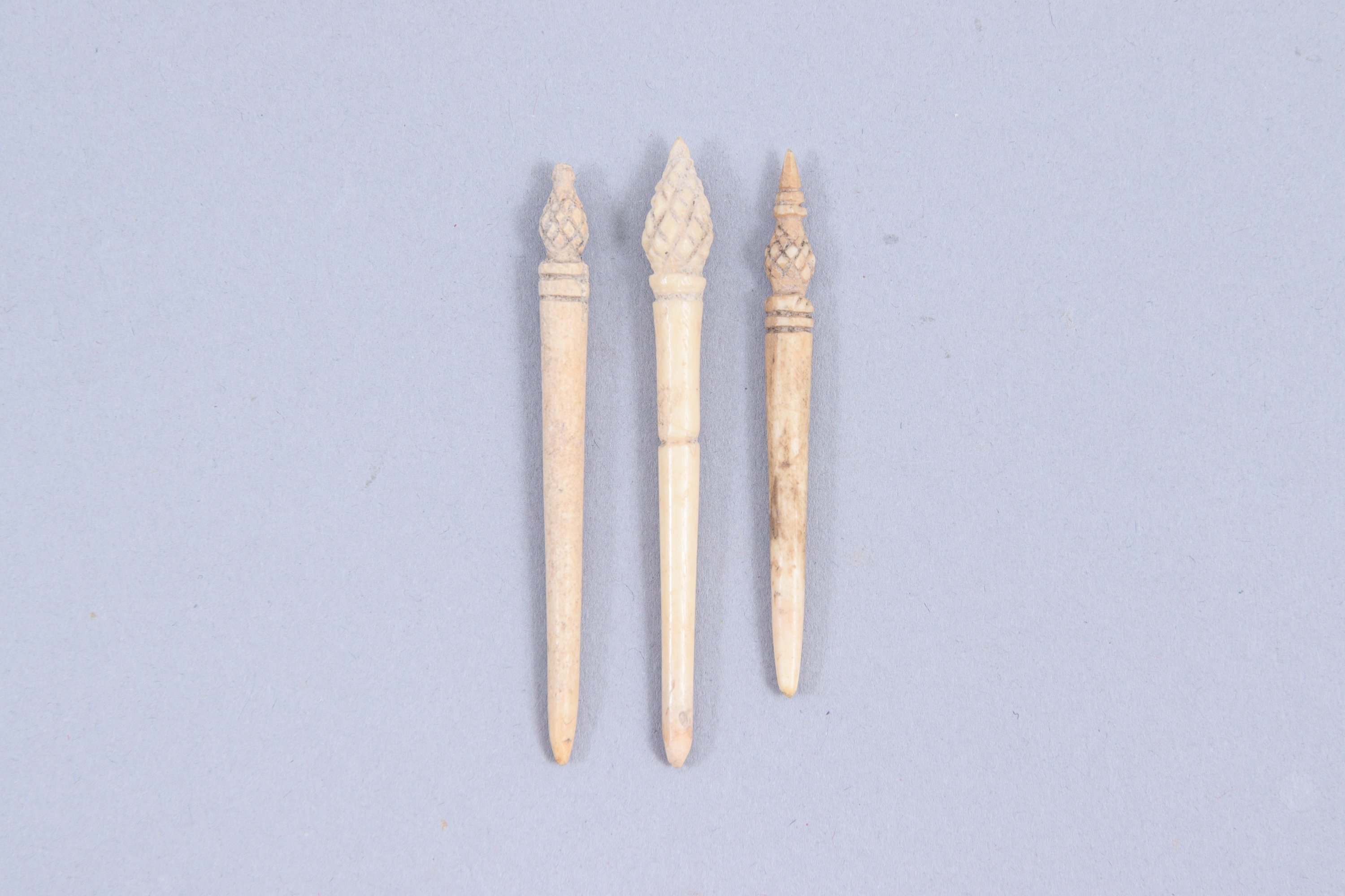 - 3 épingles romaines à tête bulbeuse striée (pomme de pin). Long. max. 6,5 cm.