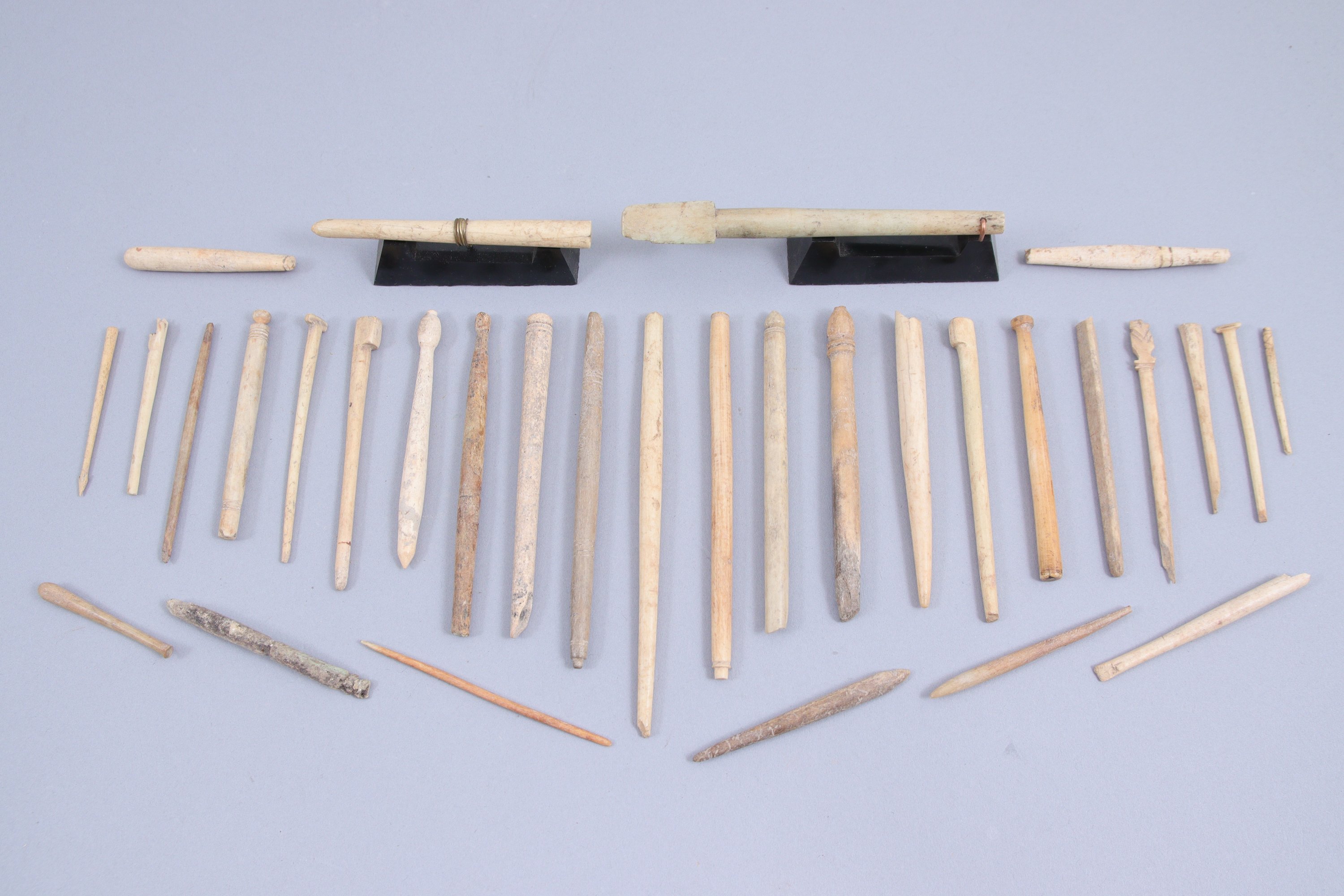 - 32 épingles (lune avec une main à son extrémité) et ustensiles allongés en os. Long. max. 14 cm. (accidents et manques).