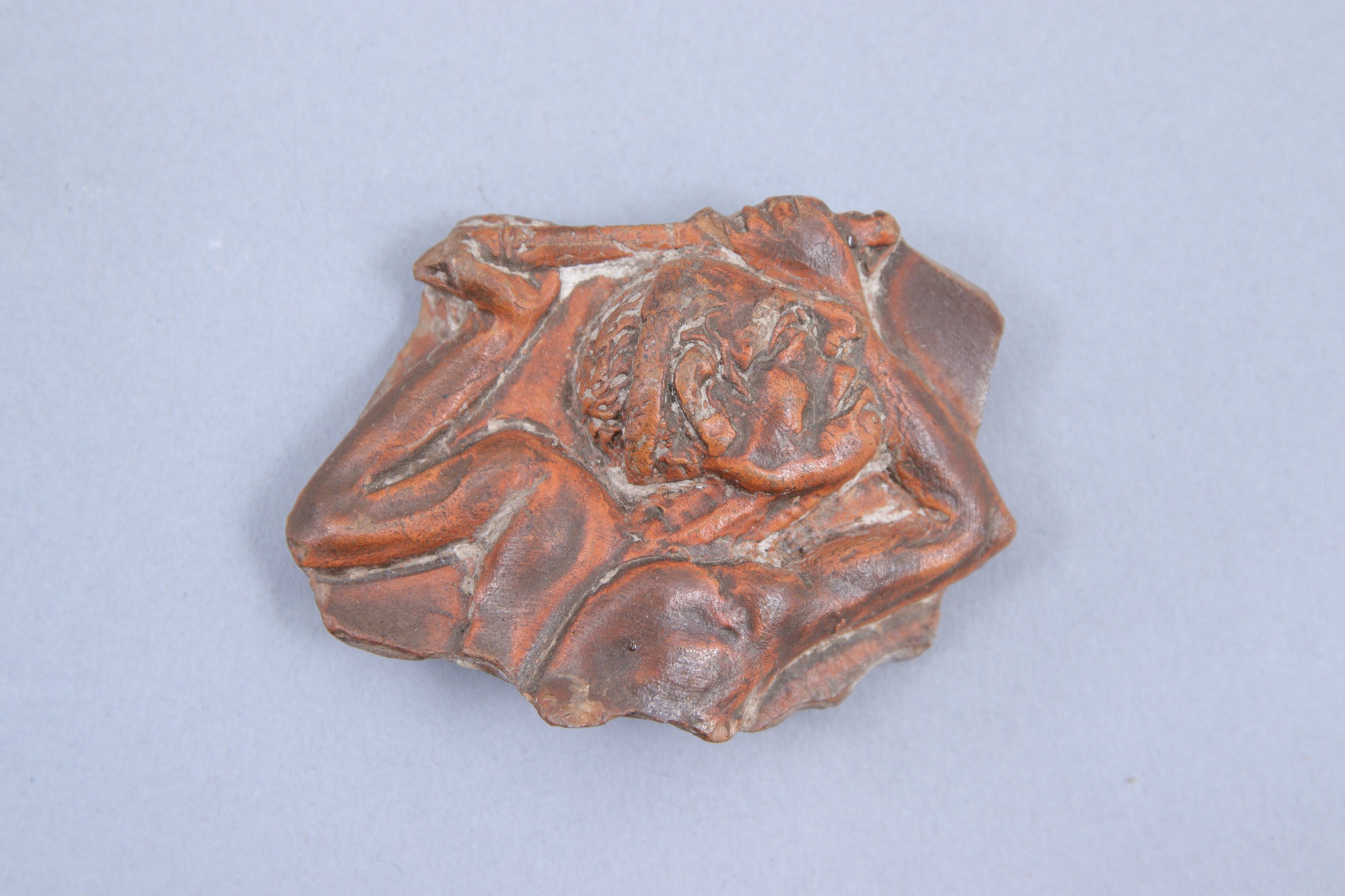 décoré en relief dun personnage grotesque, nu, coiffé dune couronne et tenant une torche (?). Au revers, inscription en grec au crayon indiquant le site dAmissos. Long. max. 5,5 cm.