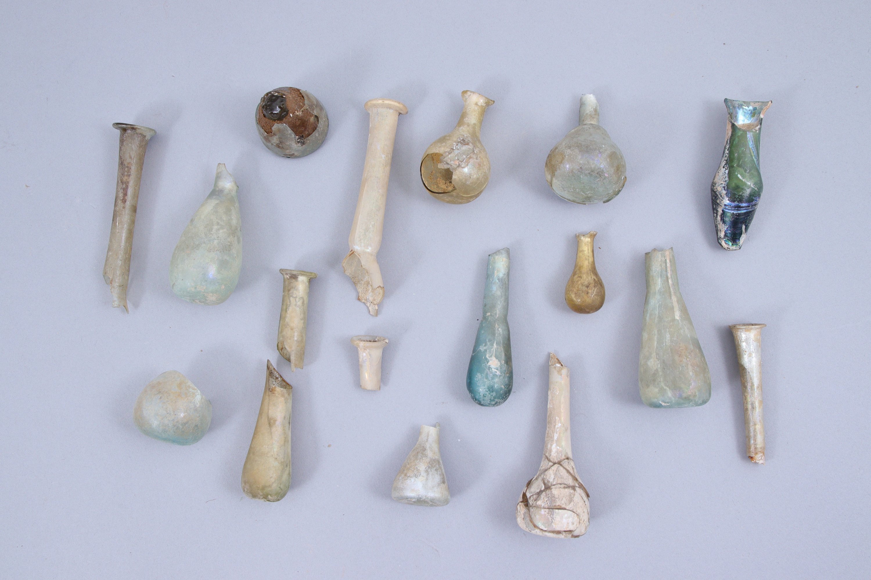 - Lot dune quinzaine de balsamaires et unguentaria en verre. Haut. max. 17 cm.