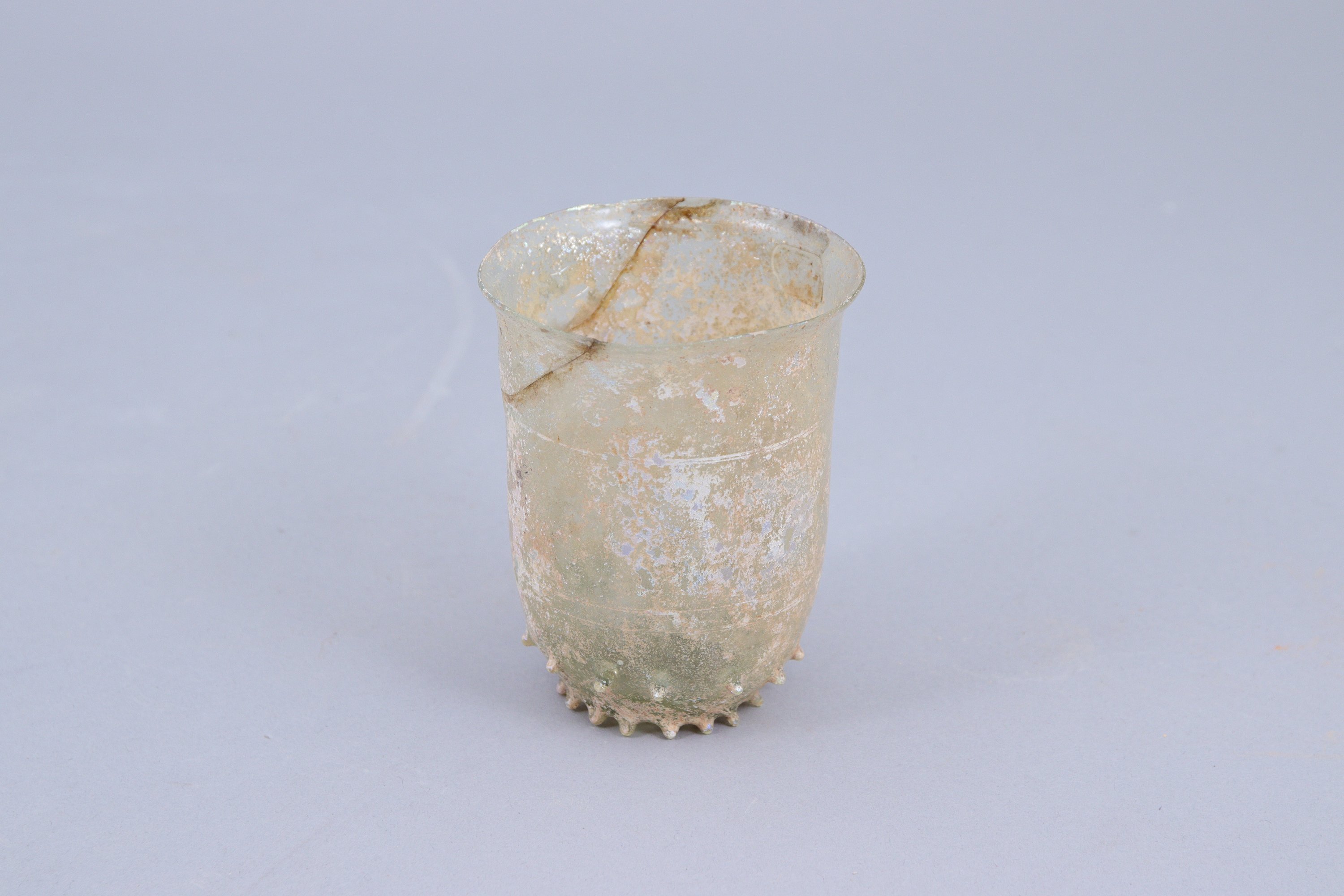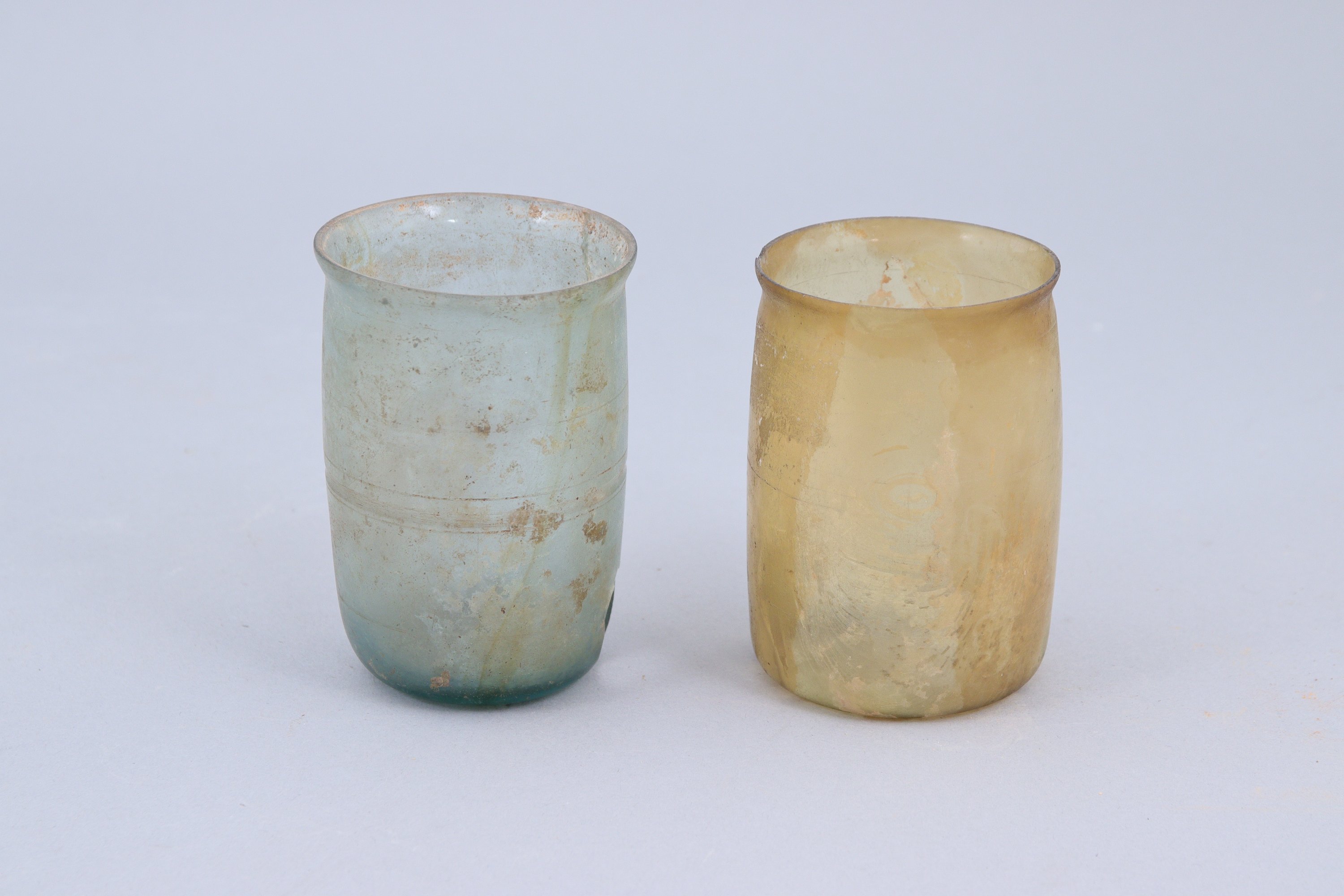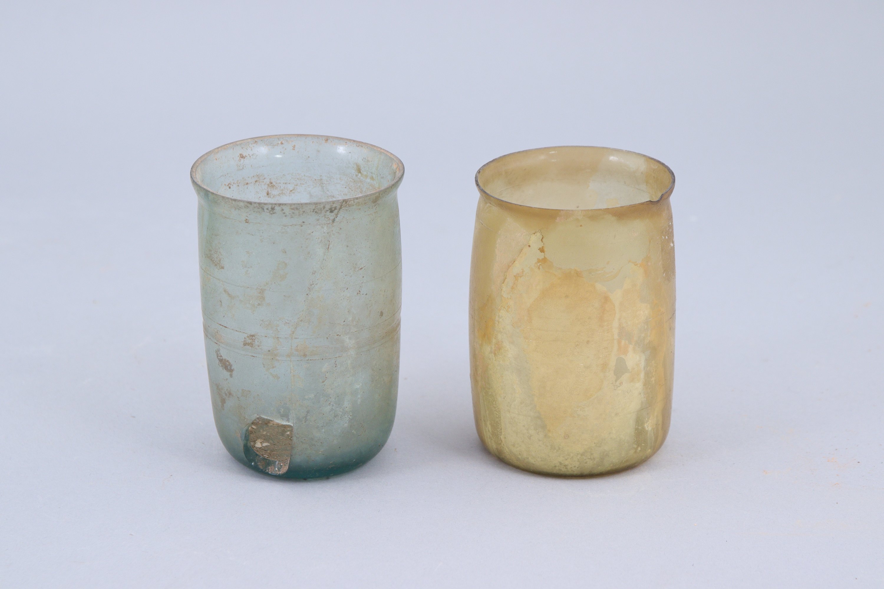 Joints : Méditerranée orientale, vers IVe s. apr. J.-C. Deux gobelets cylindriques en verre, lun jaune presque intact, lautre avec fêle et manque. Haut. max. 10 cm.