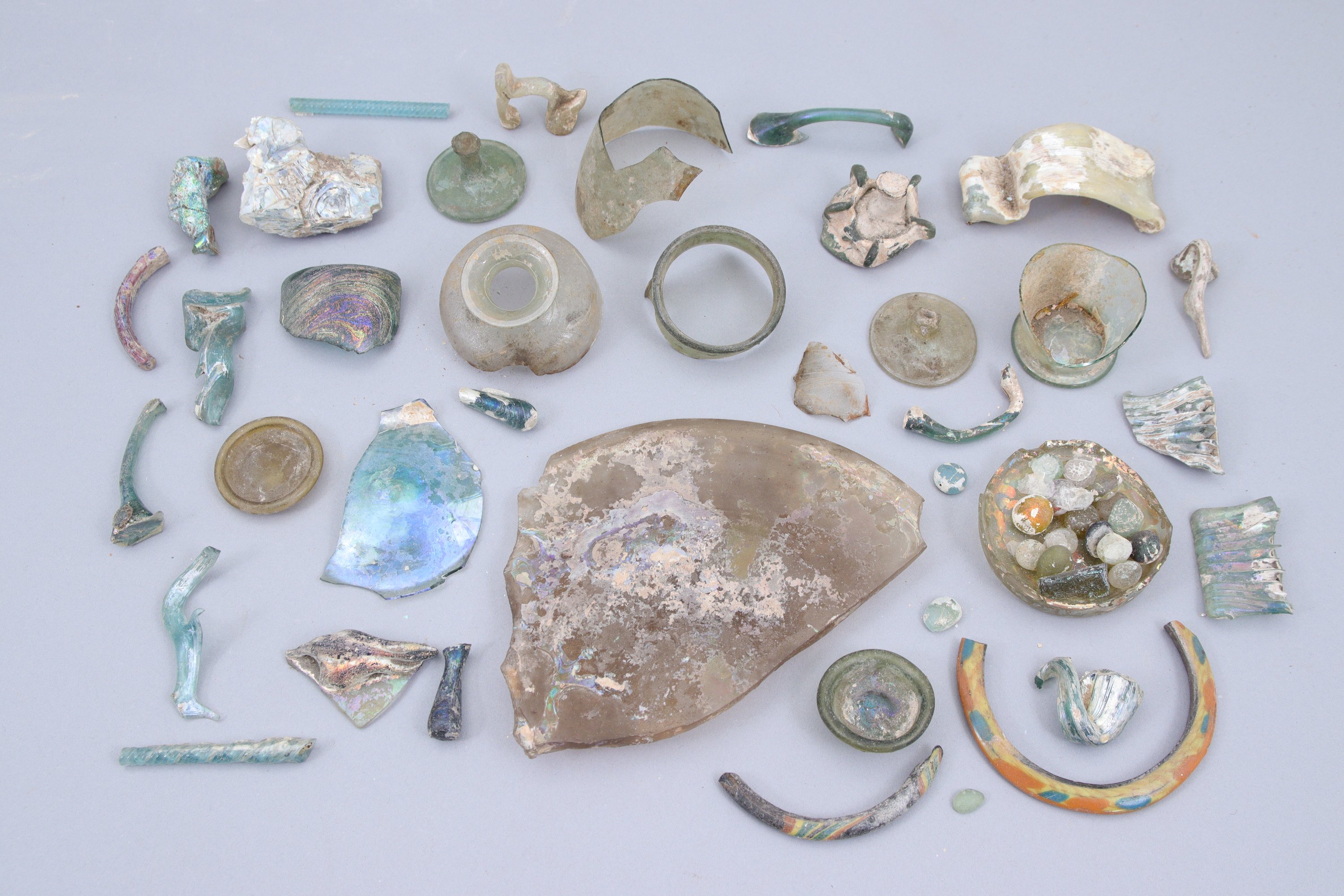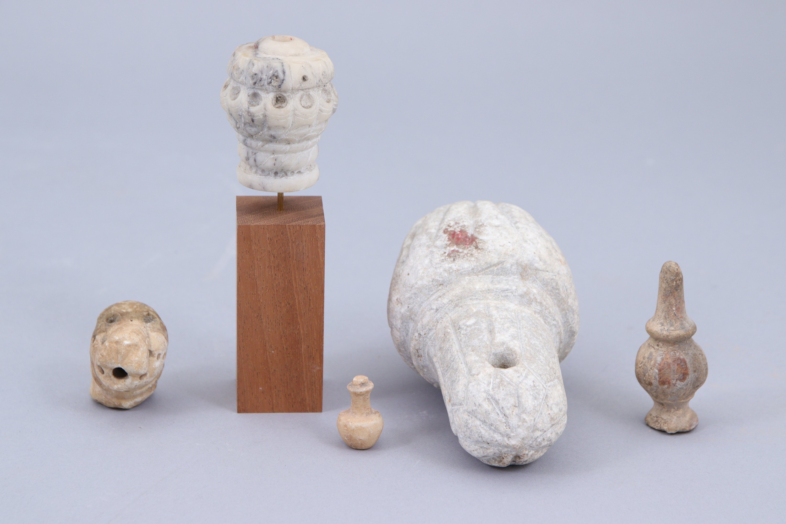 Joint : Lot dornements antiques et islamiques en pierre et céramique, dont une tête de félin. Haut. max. 11 cm. (restaurée)