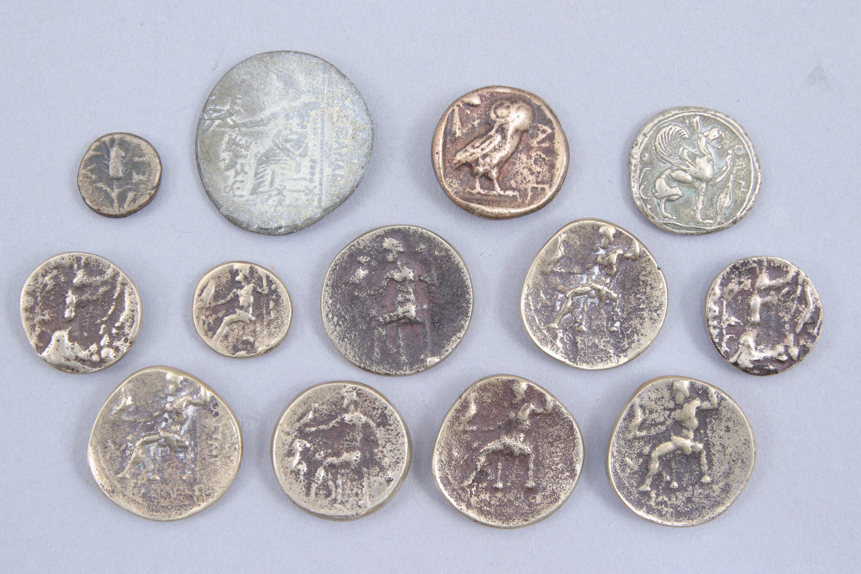 Joint : 13 imitations de monnaies grecques en métal. Diam. max. 3 cm.