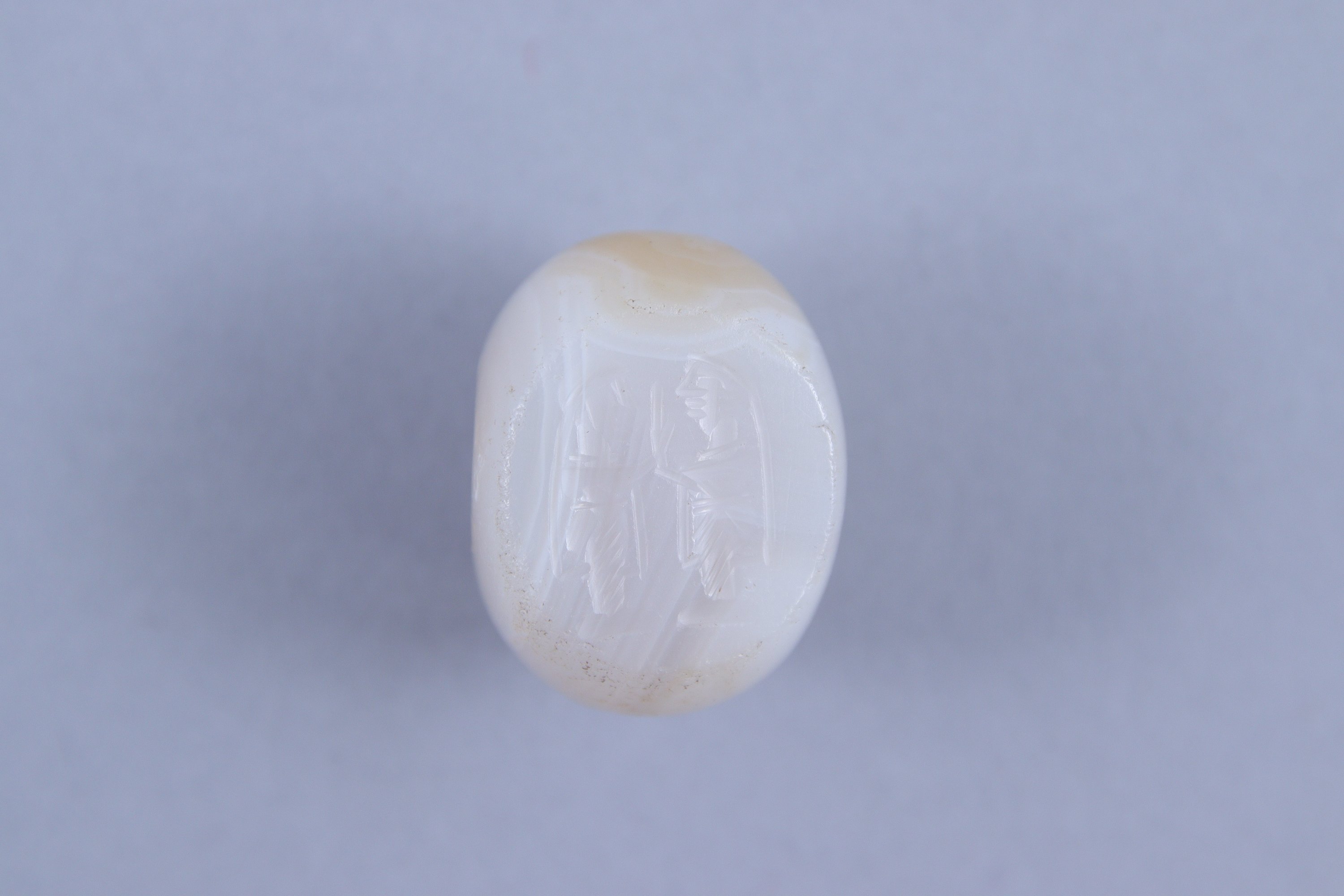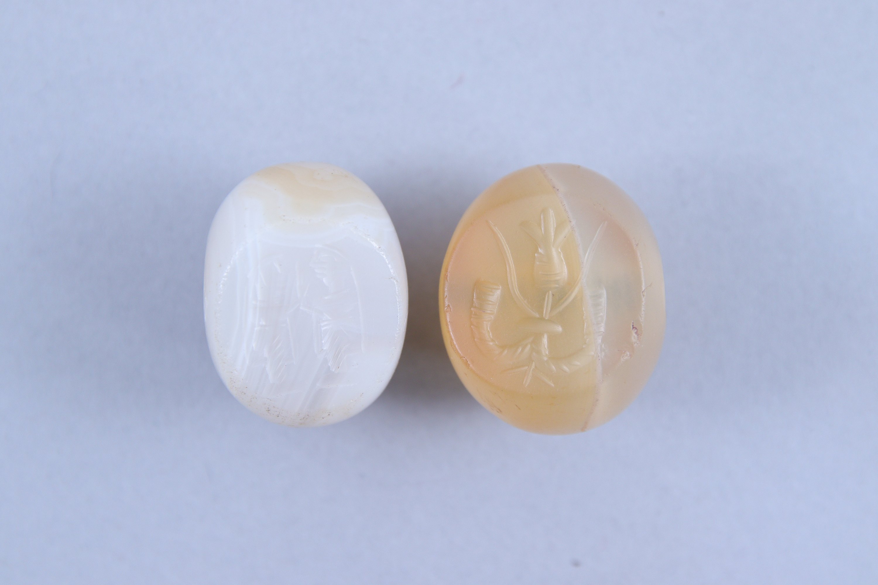 - Lun, en agate, présente deux personnages se faisant face et tenant ensemble un élément floral. Haut. intaille 2 cm. (usure sur les bordures)