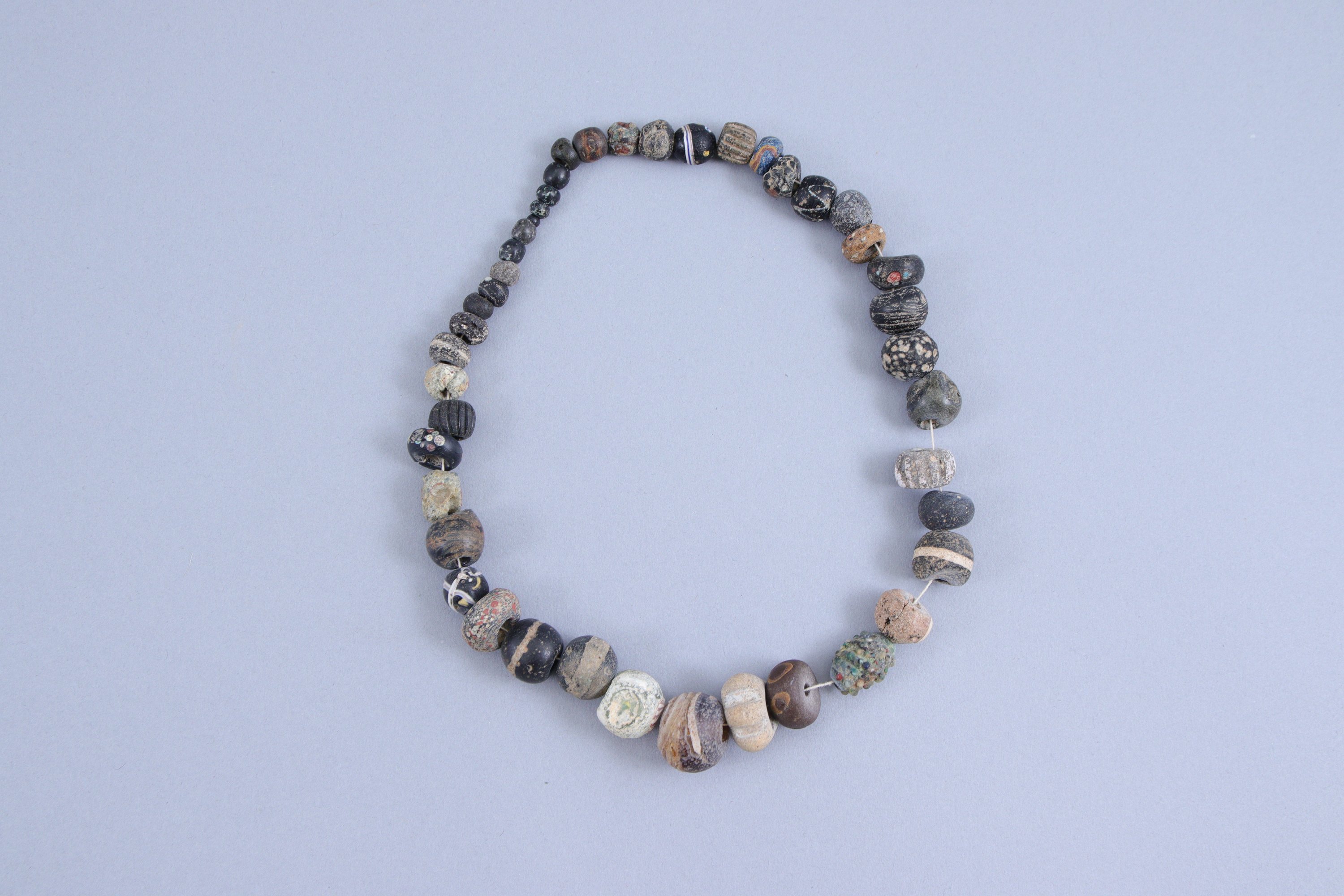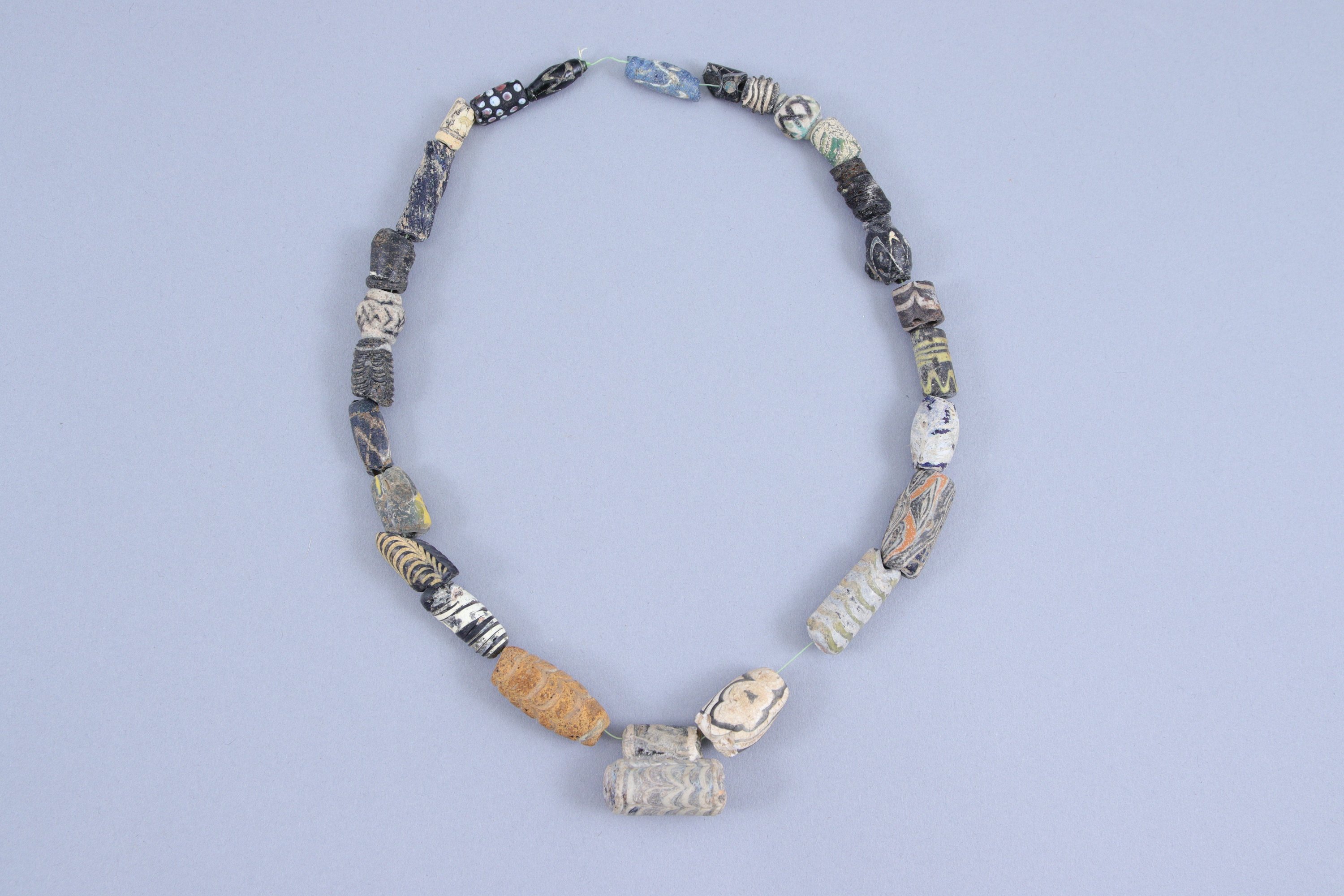 en pâte de verre multicolore, rassemblées en deux colliers.