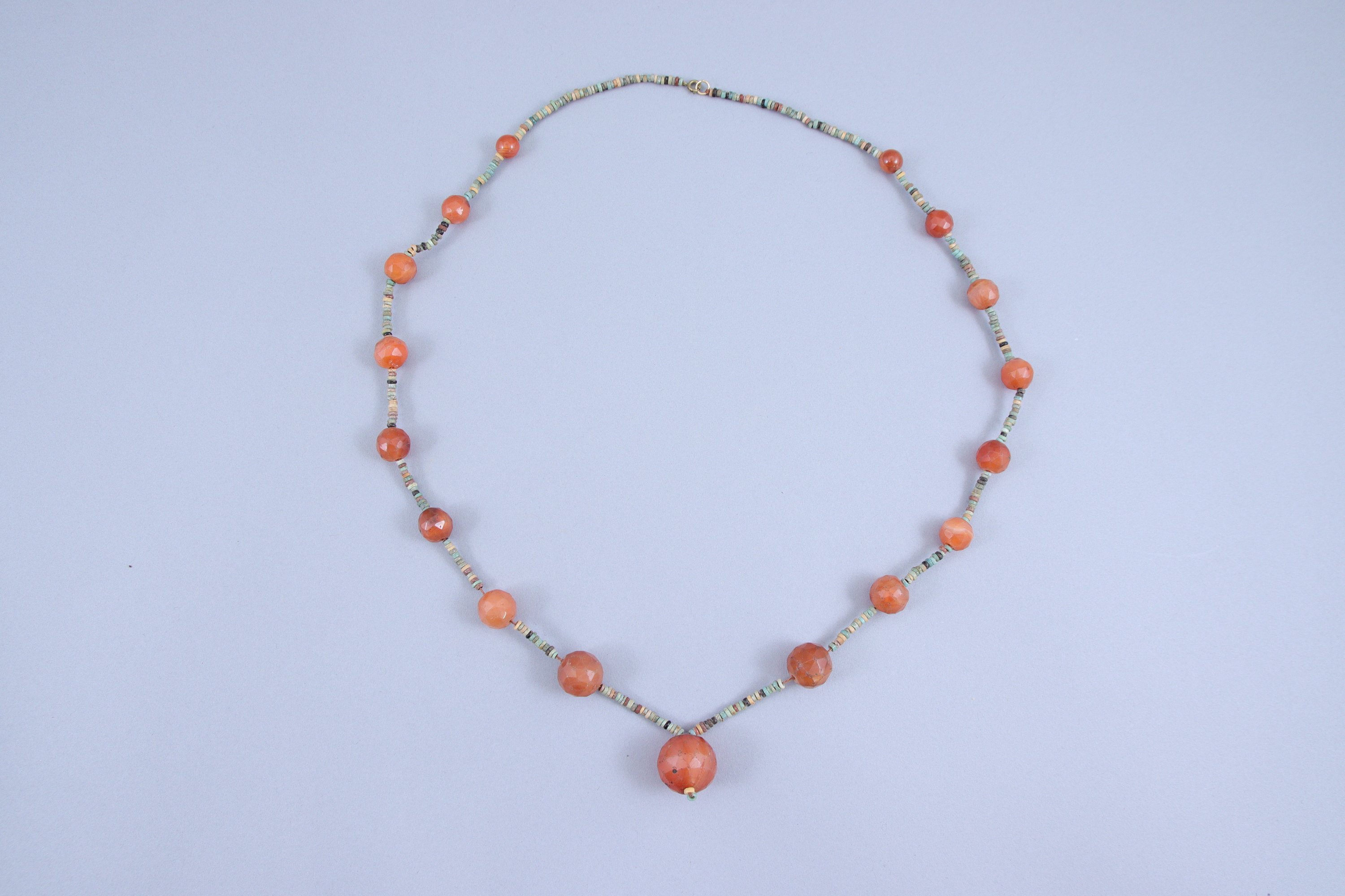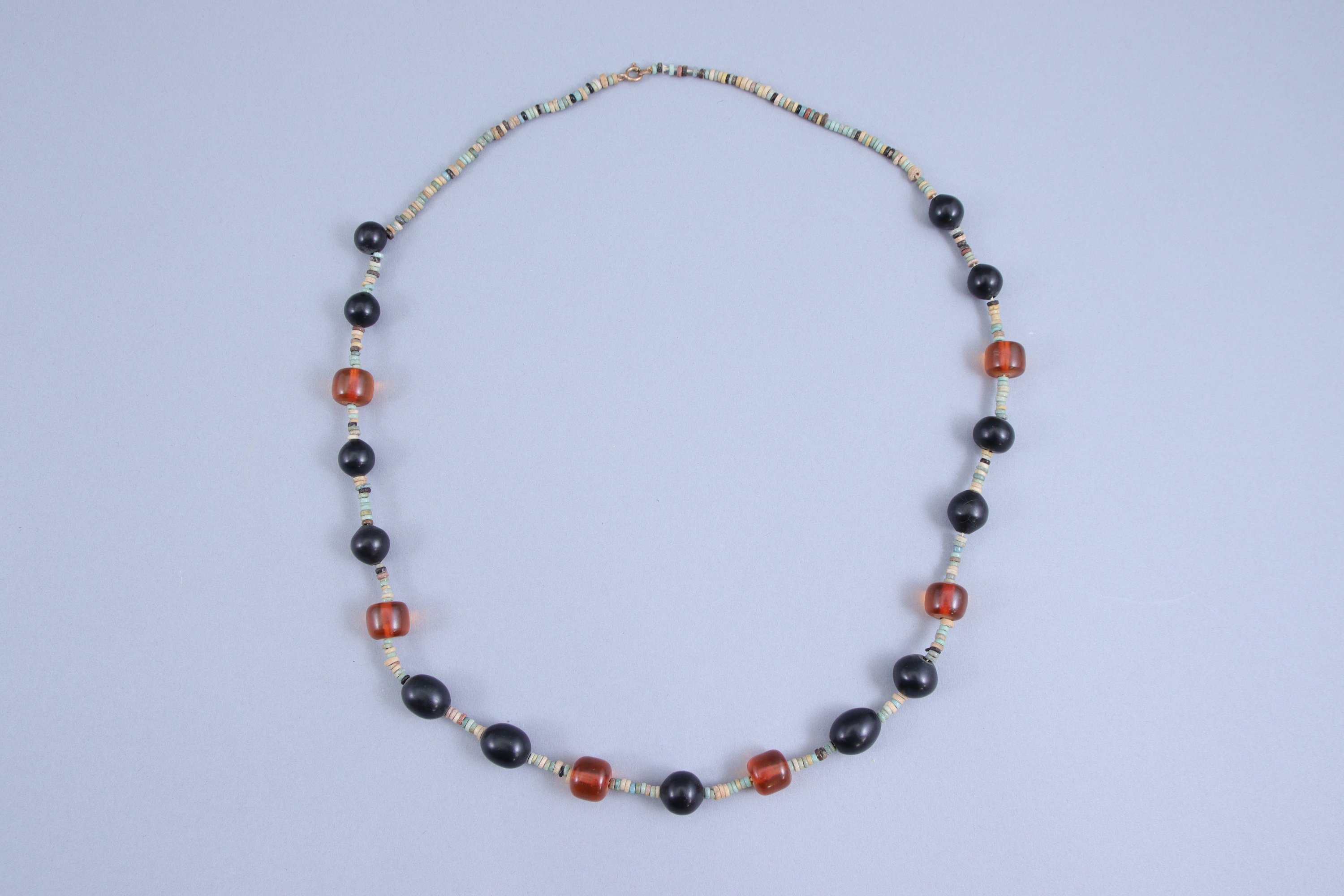 composés de petites perles annulaires en faïence égyptienne (fritte) et de perles orange (cornaline et ambre ?) et noires.