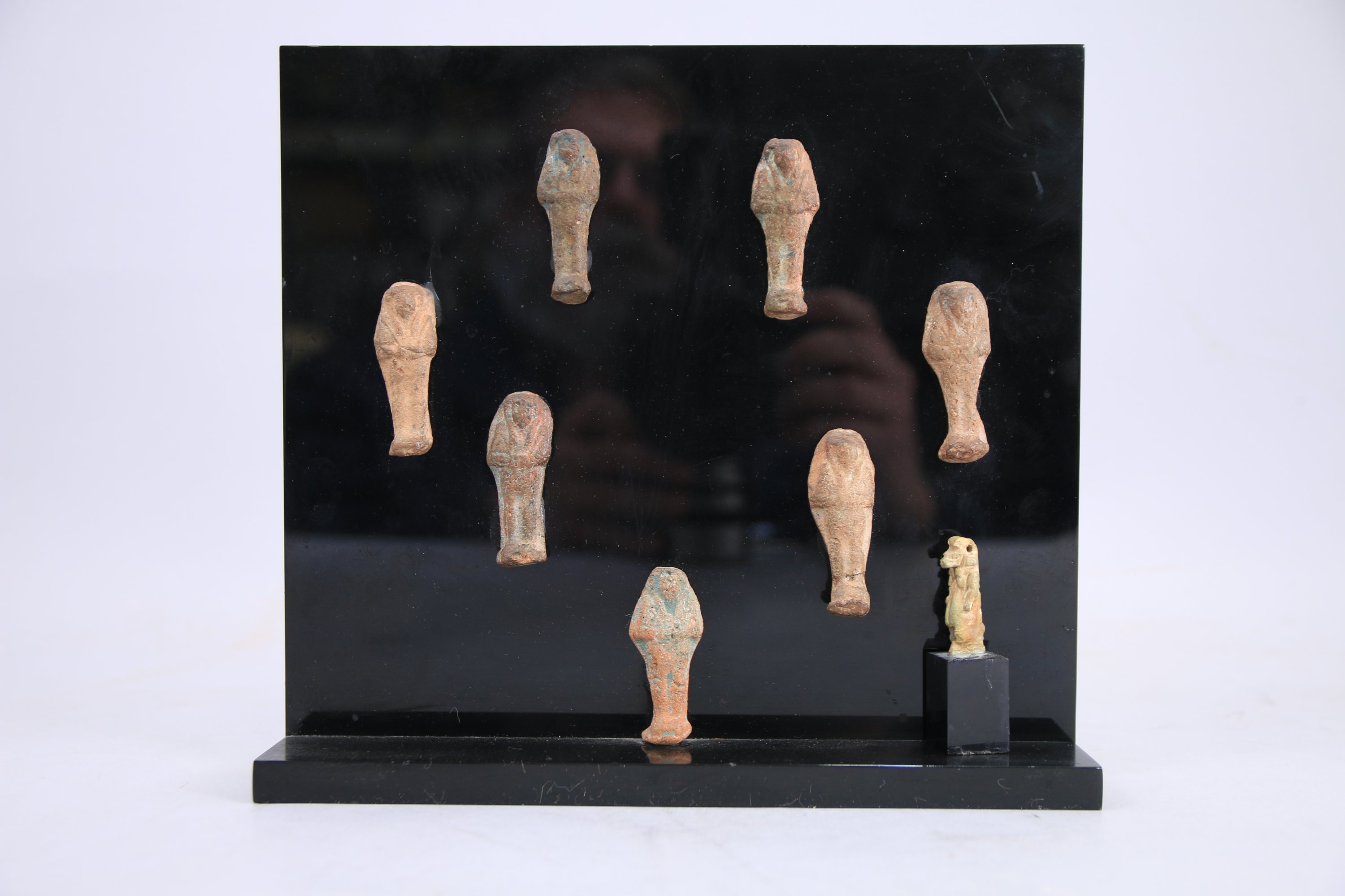en terre cuite, avec des traces de pigments verts, disposées sur un présentoir vertical.