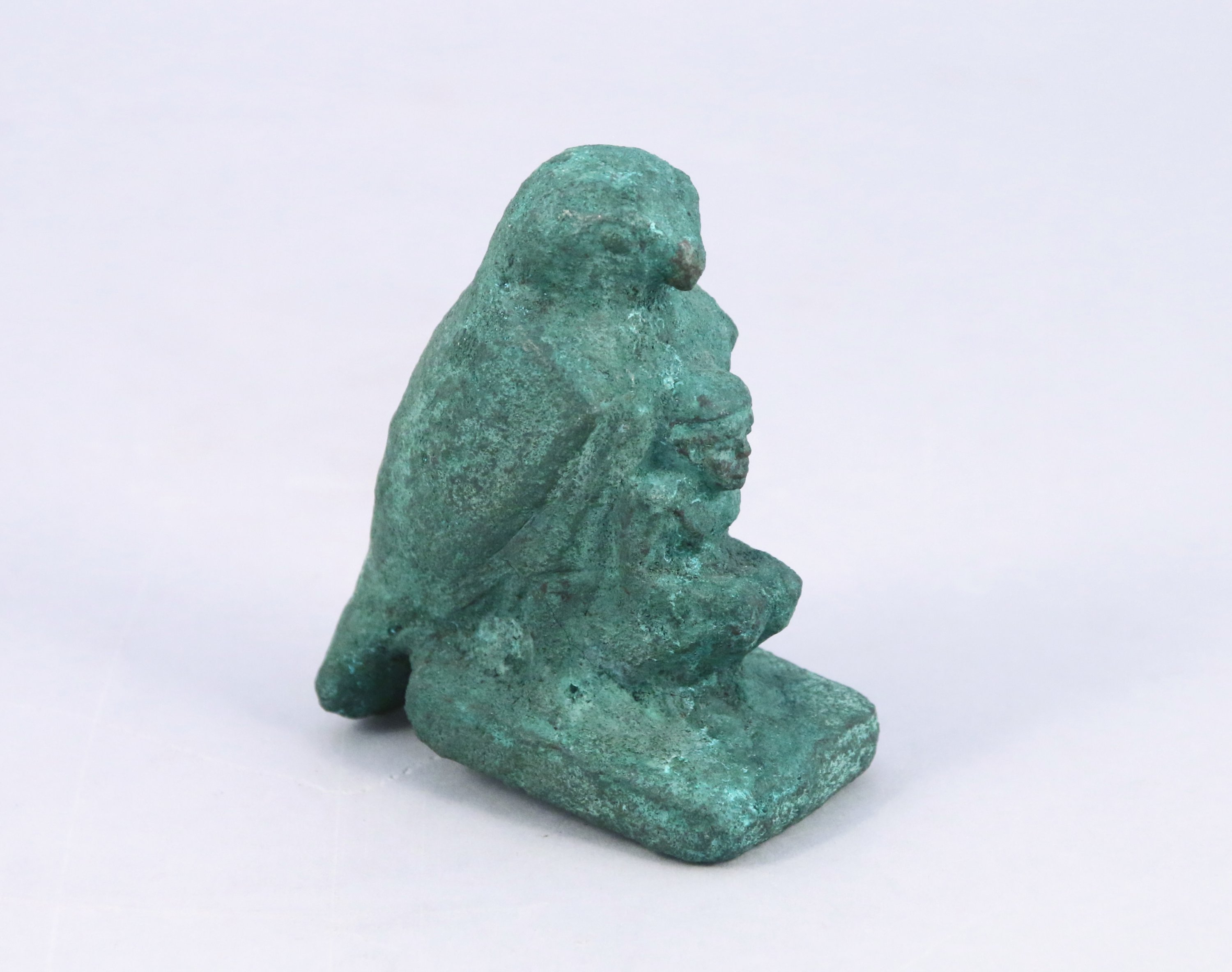 en bronze, figurant un faucon protégeant un personnage accroupi.