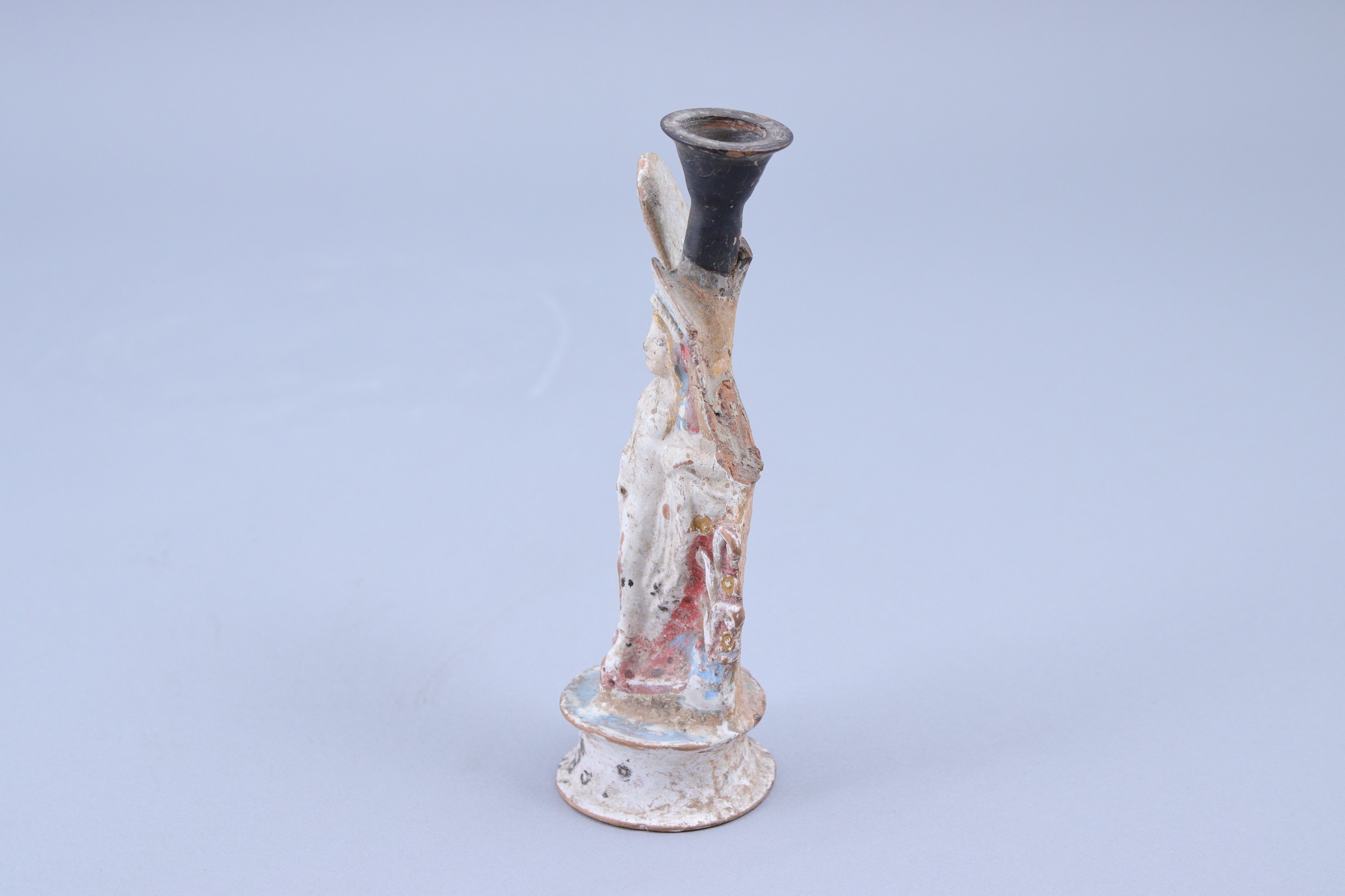 à la panse constituée dun jeune Eros debout et couronné, avec un motif végétal sous son coude gauche. Céramique à engobe blanc recouvert de dorure sur les cheveux et de peinture bleue, rouge et jaune selon les endroits. Le col est à vernis noir.