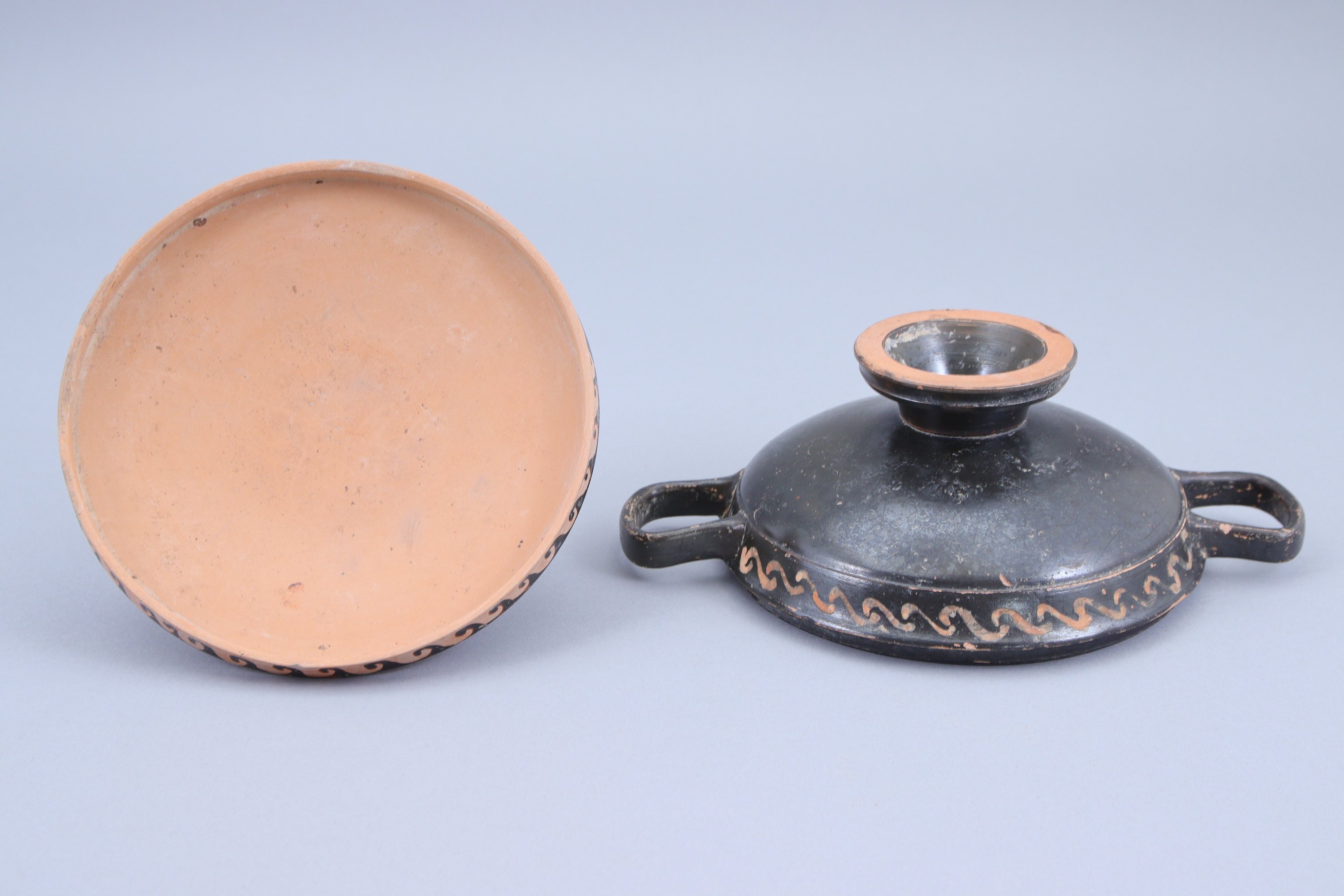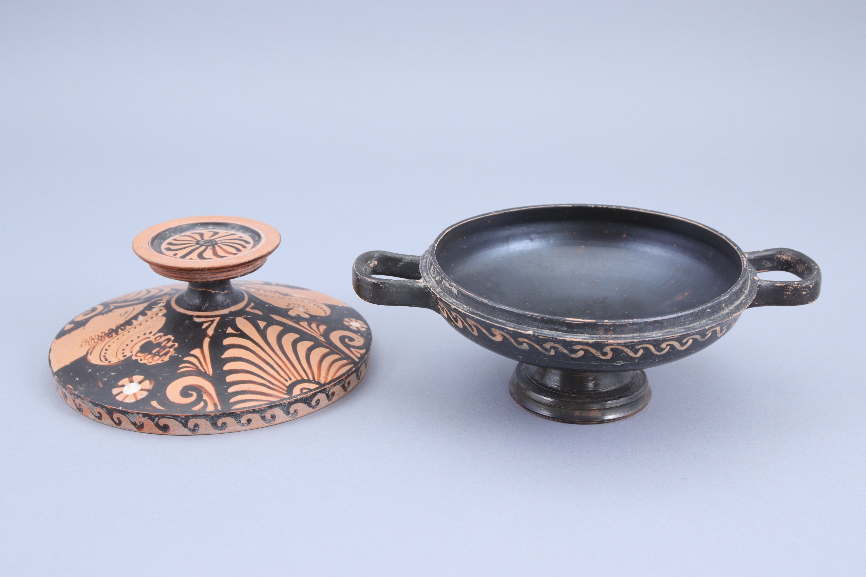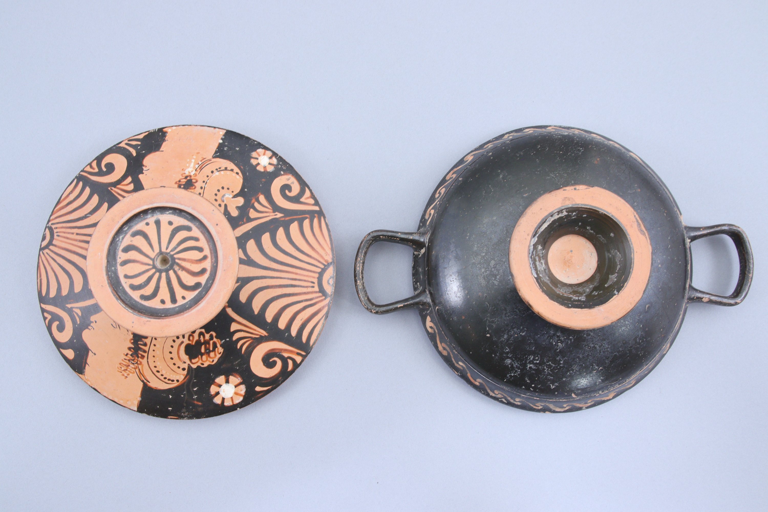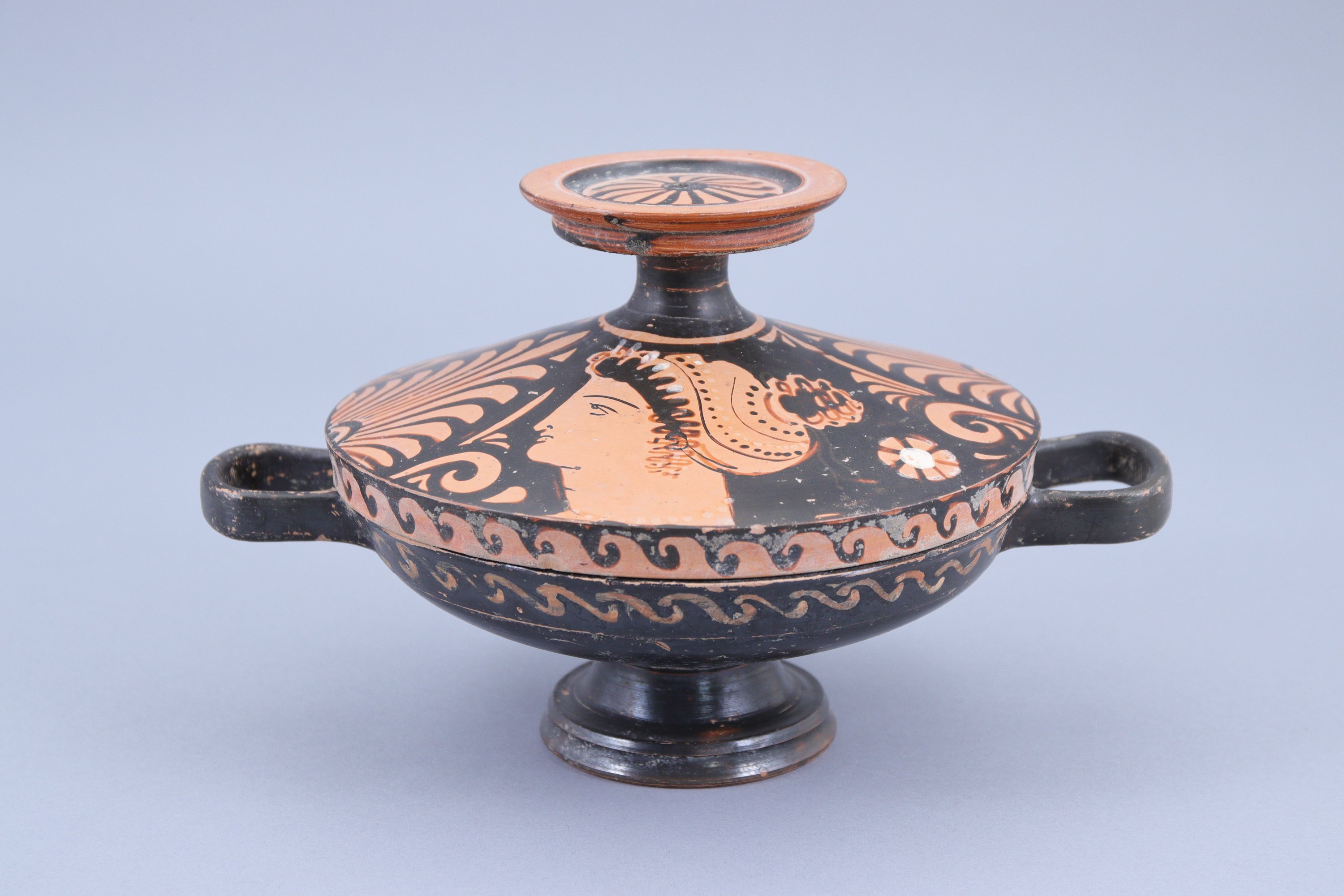 en céramique à vernis noir, décoré de deux visages féminins et de palmettes en figures rouges ainsi que de vagues sur le pourtour de la coupe et du couvercle.