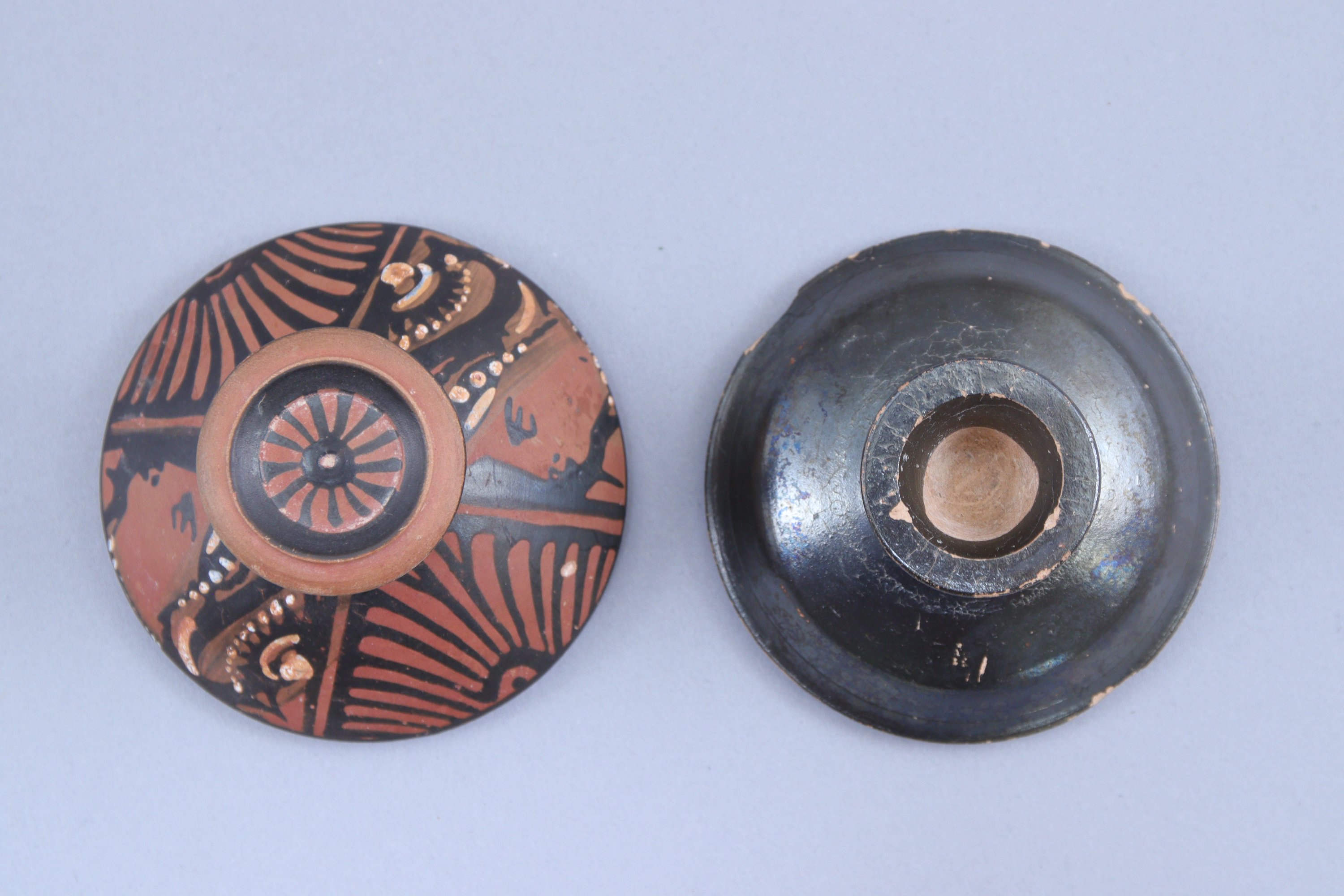 en céramique à vernis noir et figures rouges, au couvercle peint de deux visages féminins et de palmettes.