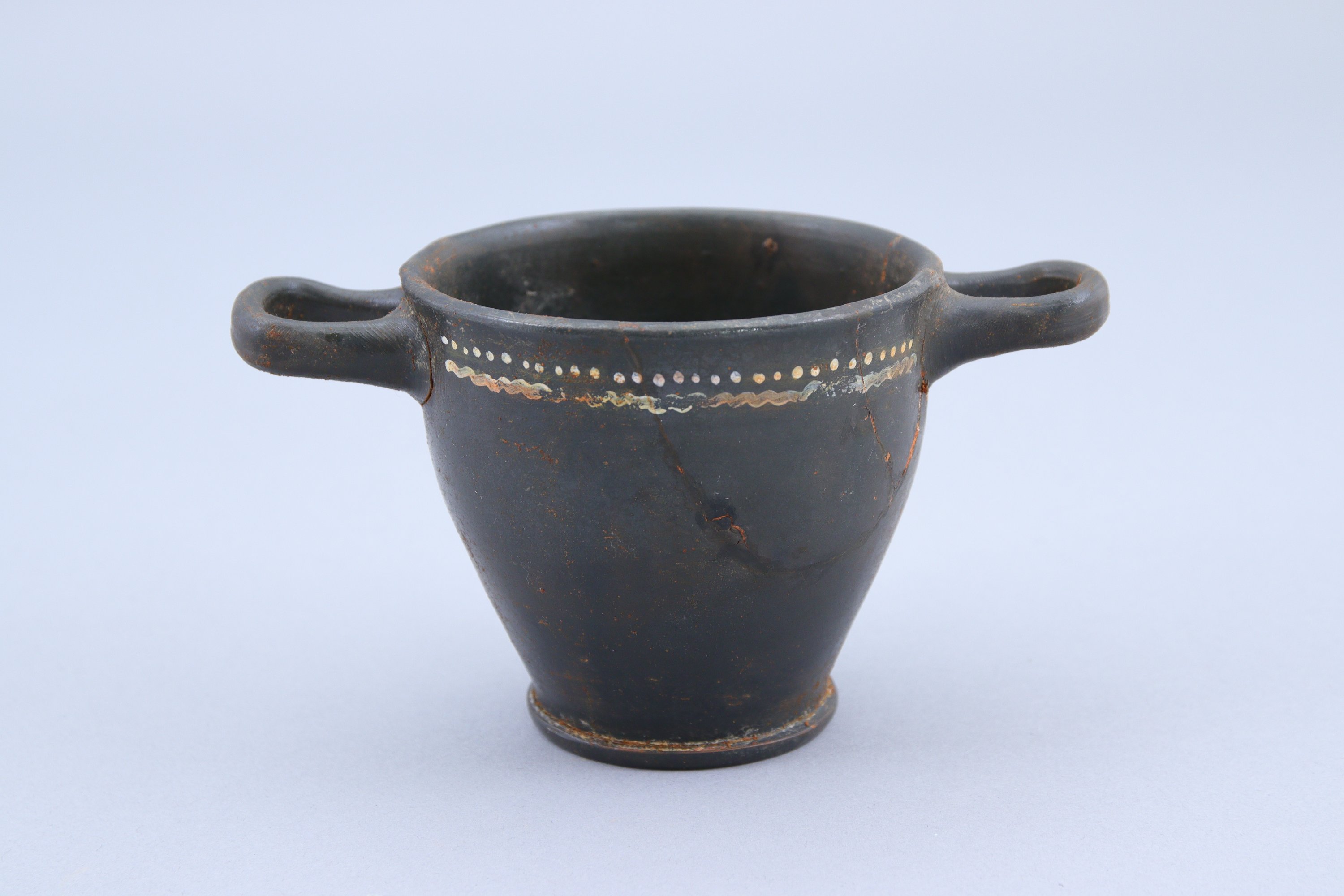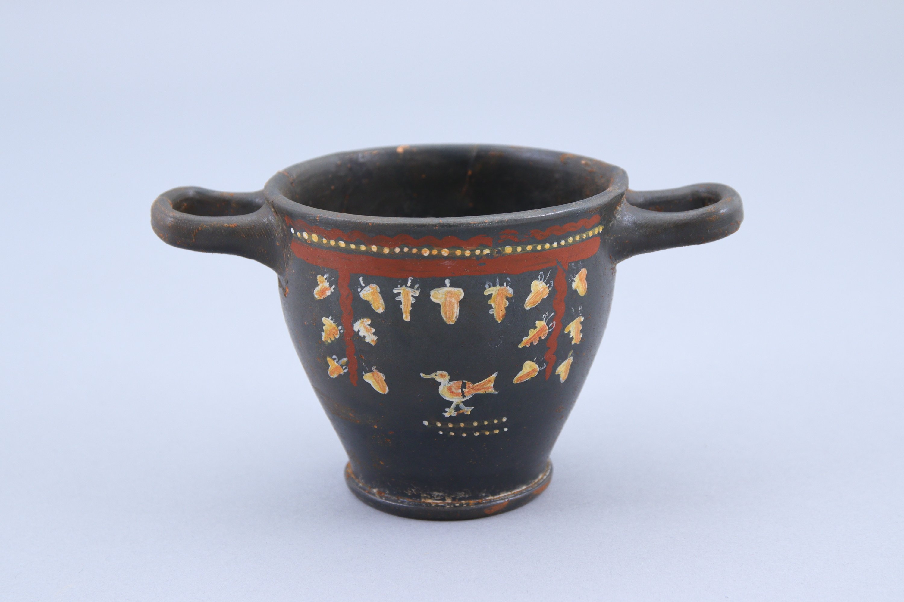 en céramique à vernis noir surpeinte dans le style de Gnathia, figurant un oiseau sous une treille de vigne, en rehauts blanc, jaune et rouge.