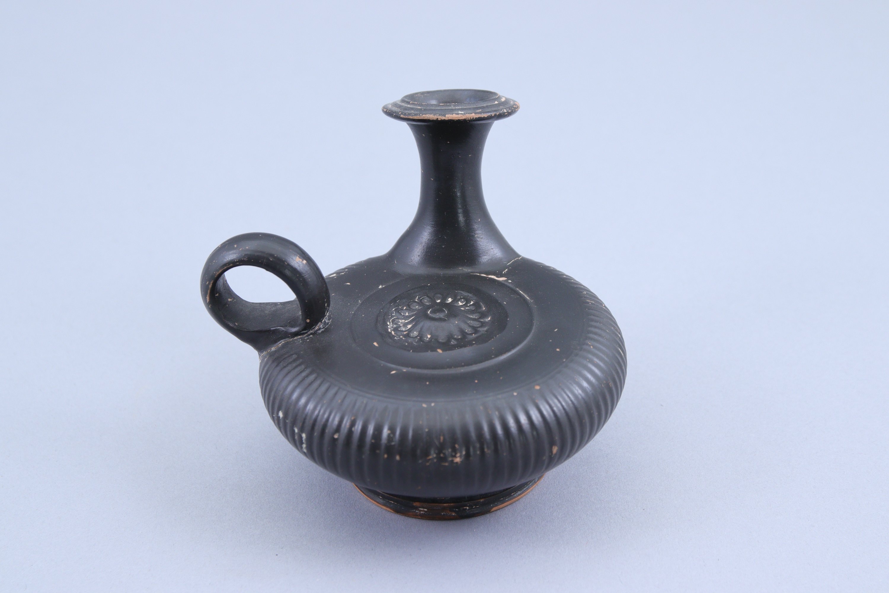 en céramique à vernis noir décoré dune rosette dans le médaillon central.